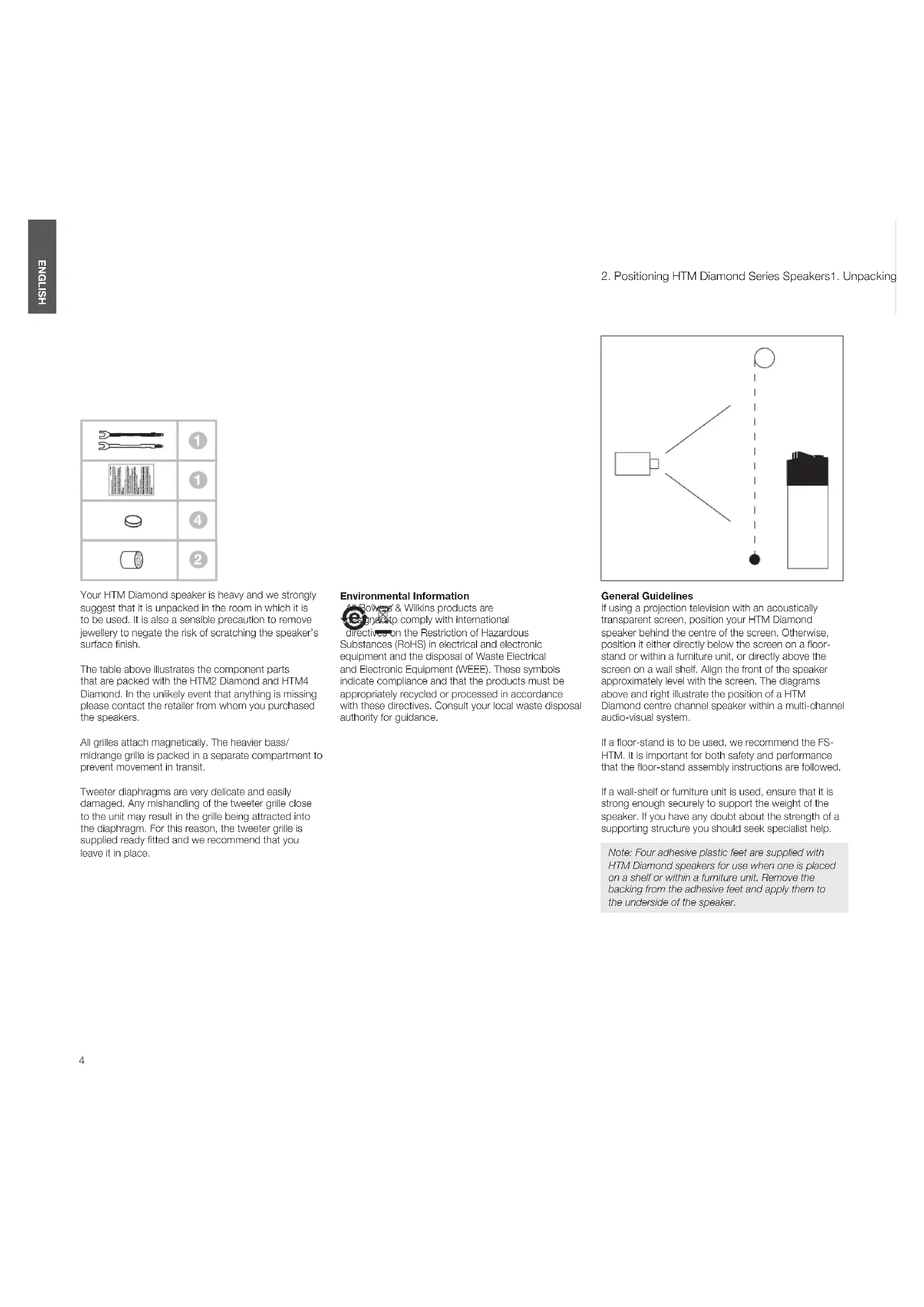 Your HTM Diamond speaker is heavy and we strongly suggest that it is unpacked in the room in which it is to be used. It is also a sensible precaution to remove jewellery to negate the risk of scratching the speaker’s surface nish. The table above illustrates the component parts that are packed with the HTM2 Diamond and HTM4 Diamond. In the unlikely event that anything is missing please contact the retailer from whom you purchased the speakers. All grilles attach magnetically. The heavier bass/ midrange grille is packed in a separate compartment to prevent movement in transit. Tweeter diaphragms are very delicate and easily damaged. Any mishandling of the tweeter grille close to the unit may result in the grille being attracted into the diaphragm. For this reason, the tweeter grille is supplied ready tted and we recommend that you leave it in place. Environmental Information All Bowers & Wilkins products are designed to comply with international directives on the Restriction of Hazardous Substances (RoHS) in electrical and electronic equipment and the disposal of Waste Electrical and Electronic Equipment (WEEE). These symbols indicate compliance and that the products must be appropriately recycled or processed in accordance with these directives. Consult your local waste disposal authority for guidance. General Guidelines If using a projection television with an acoustically transparent screen, position your HTM Diamond speaker behind the centre of the screen. Otherwise, position it either directly below the screen on a oor- stand or within a furniture unit, or directly above the screen on a wall shelf. Align the front of the speaker approximately level with the screen. The diagrams above and right illustrate the position of a HTM Diamond centre channel speaker within a multi-channel audio-visual system. If a oor-stand is to be used, we recommend the FS- HTM. It is important for both safety and performance that the oor-stand assembly instructions are followed. If a wall-shelf or furniture unit is used, ensure that it is strong enough securely to support the weight of the speaker. If you have any doubt about the strength of a supporting structure you should seek specialist help. Note: Four adhesive plastic feet are supplied with HTM Diamond speakers for use when one is placed on a shelf or within a furniture unit. Remove the backing from the adhesive feet and apply them to the underside of the speaker.5 ENGLISH
