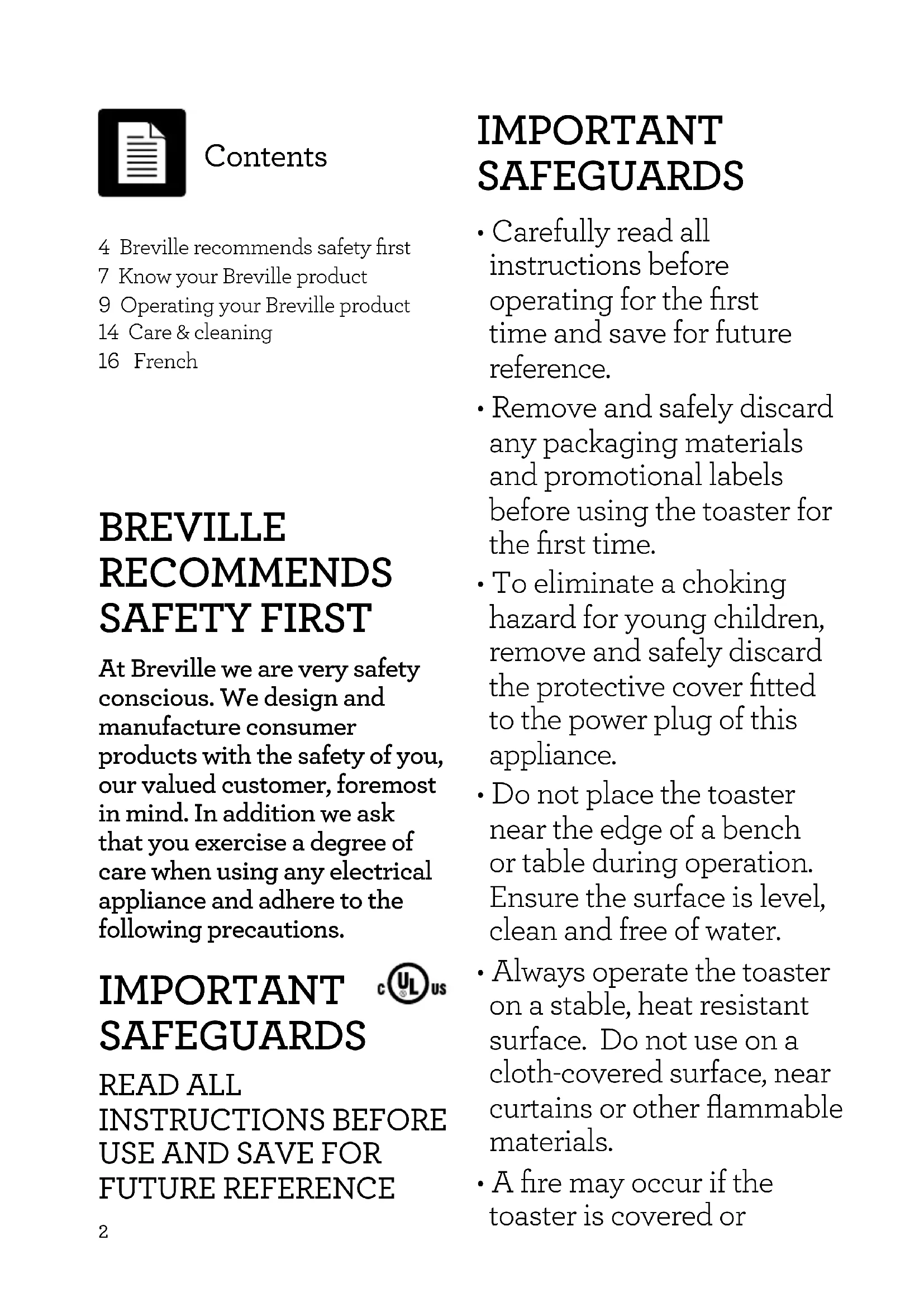 - A fire may occur if the toaster is covered or 4 Breville recommends safety first 7 Know your Breville product 9 Operating your Breville product 14 Care & cleaning 16 French Contents3 touching flammable materials, including curtains, draperies, walls and the like, when in operation.