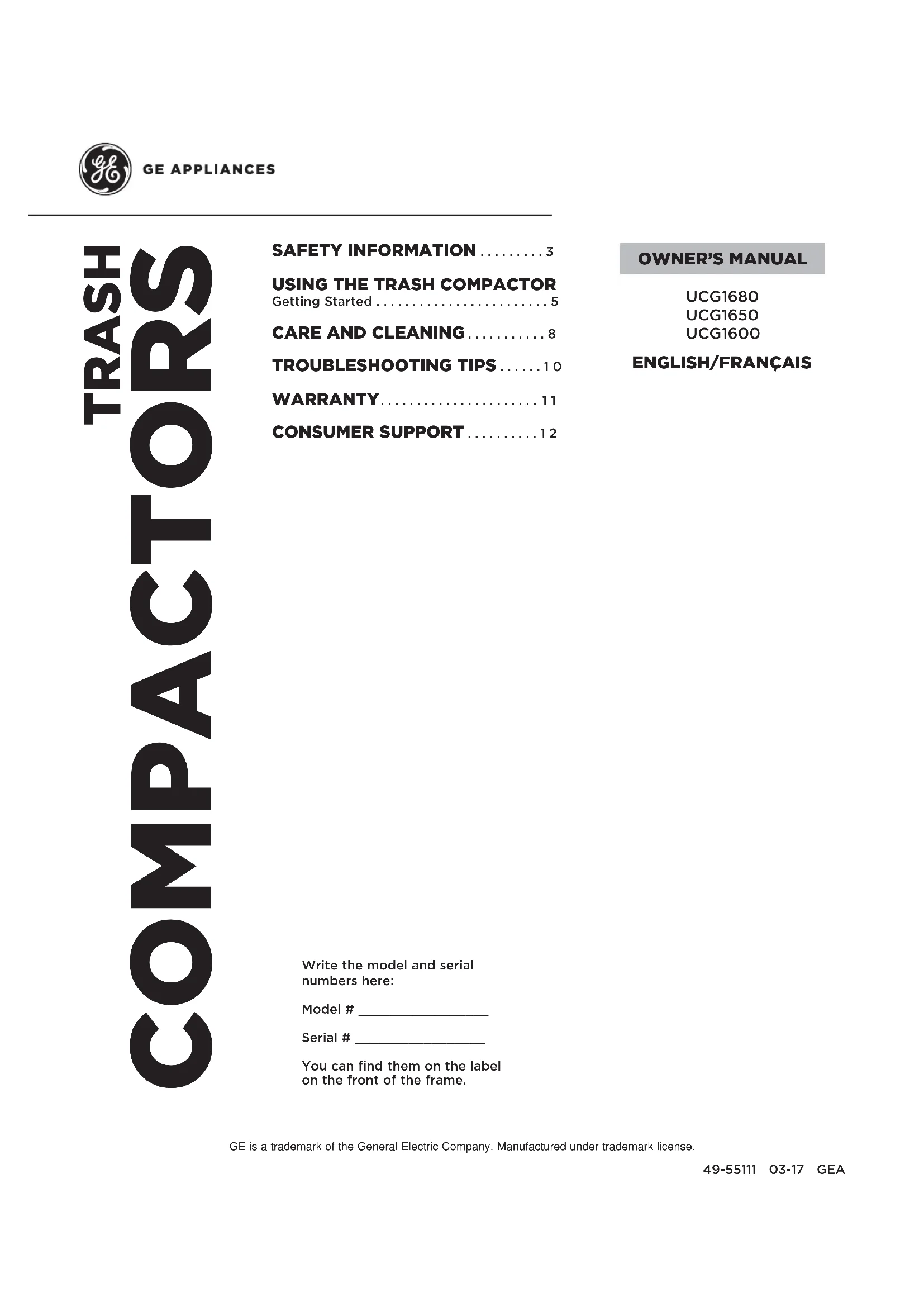 Your sole and exclusive remedy is product repair as provided in this Limited Warranty. Any implied warranties, including the implied warranties of merchantability or fitness for a particular purpose, are limited to one year or the shortest period allowed by law.12 49-55111 Consumer Support CONSUMER SUPPORT GE Appliances Website Have a question or need assistance with your appliance? Try the GE Appliances Website 24 hours a day, any day of the year! You can also shop for more great GE Appliances products and take advantage of all our on-line support services designed for your convenience. In the US: GEAppliances.com Register Your Appliance Register your new appliance on-line at your convenience! Timely product registration will allow for enhanced communication and prompt service under the terms of your warranty, should the need arise. You may also mail in the pre-printed registration card included in the packing material. In the US: GEAppliances.com/register Schedule Service Expert GE Appliances repair service is only one step away from your door. Get on-line and schedule your service at your convenience any day of the year. In the US: GEAppliances.com/ge/service-and-support/service.htm or call 800.432.2737 during normal business hours. Extended Warranties Purchase a GE Appliances extended warranty and learn about special discounts that are available while your warranty is still in effect. You can purchase it on-line anytime. GE Appliances Services will still be there after your warranty expires. In the US: GEAppliances.com/ge/service-and-support/shop-for-extended-service-plans.htm or call 800.626.2224 during normal business hours. Parts and Accessories Individuals qualified to service their own appliances can have parts or accessories sent directly to their homes (VISA, MasterCard and Discover cards are accepted). Order on-line today 24 hours every day. In the US: GEApplianceparts.com or by phone at 877.959.8688 during normal business hours. Instructions contained in this manual cover procedures to be performed by any user. Other servicing generally should be referred to qualified service personnel. Caution must be exercised, since improper servicing may cause unsafe operation. Contact Us If you are not satisfied with the service you receive from GE Appliances, contact us on our Website with all the details including your phone number, or write to: In the US: General Manager, Customer Relations | GE Appliances, Appliance Park | Louisville, KY 40225 GEAppliances.com/ge/service-and-support/contact.htmInscrivez ci-dessous les numéros de modèle et de sérieN° de modèle ____________N° de série ______________Vous les trouverez sur l’étiquette apposée sur la partie avant du cadre de l’appareil.GE est une marque déposée de General Electric Company. Fabriqué sous licence de marque. MANUEL D’UTILISATION COMPACTEURS de déchets
