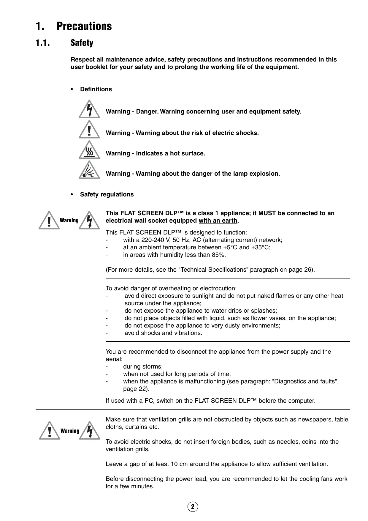 (Pour plus de détails, voir le paragraphe “spécifications techniques” page 26). Pour éviter les risques d'échauffement ou d'électrocution : éviter une exposition directe aux rayons du soleil et ne pas placer au dessus de l'appareil une flamme nue, telle une bougie ou toute autre source de chaleur. ne pas exposer l'appareil à l'égouttement ou à l'éclaboussement d'eau. ne pas placer sur l'appareil des objets remplis de liquides, tels des vases à fleurs. ne pas exposer l'appareil à un environnement fortement poussiéreux. éviter les chocs et les vibrations. Il est recommandé de débrancher l'appareil du réseau électrique et de l'antenne : en cas d'orage. en cas de non-utilisation prolongée. en cas d'anomalie de fonctionnement (voir le paragraphe “Diagnostics et pannes” page 22). En cas d'utilisation avec un ordinateur PC, allumer l'ECRAN PLAT DLP™ avant l'ordinateur.