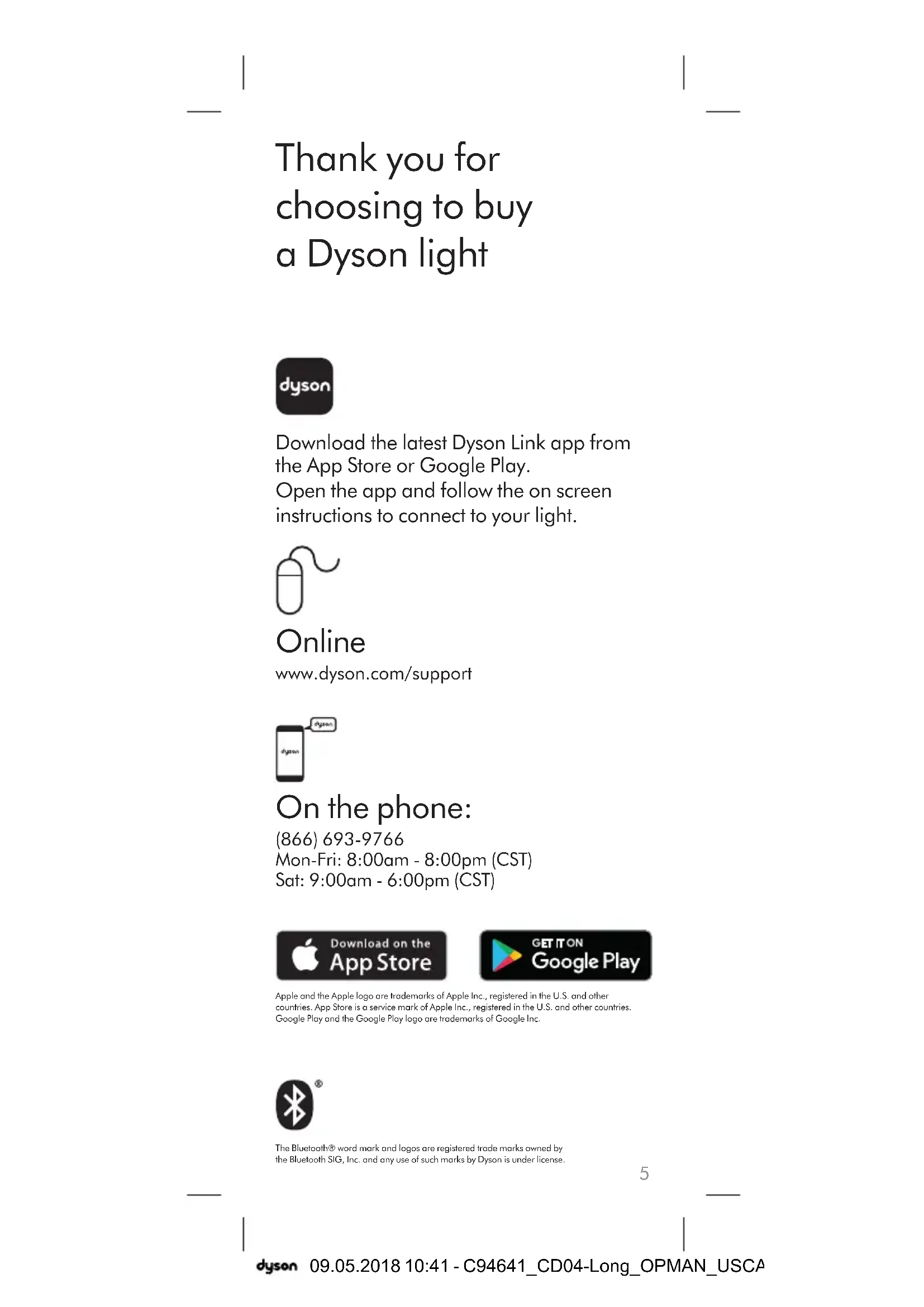 Download the latest Dyson Link app from the App Store or Google Play. Open the app and follow the on screen instructions to connect to your light. Apple and the Apple logo are trademarks of Apple Inc., registered in the U.S. and other countries. App Store is a service mark of Apple Inc., registered in the U.S. and other countries. Google Play and the Google Play logo are trademarks of Google Inc. Thank you for choosing to buy a Dyson light Online www.dyson.com/support On the phone: (866) 693-9766 Mon-Fri: 8:00am - 8:00pm (CST) Sat: 9:00am - 6:00pm (CST) The Bluetooth® word mark and logos are registered trade marks owned by the Bluetooth SIG, Inc. and any use of such marks by Dyson is under license.