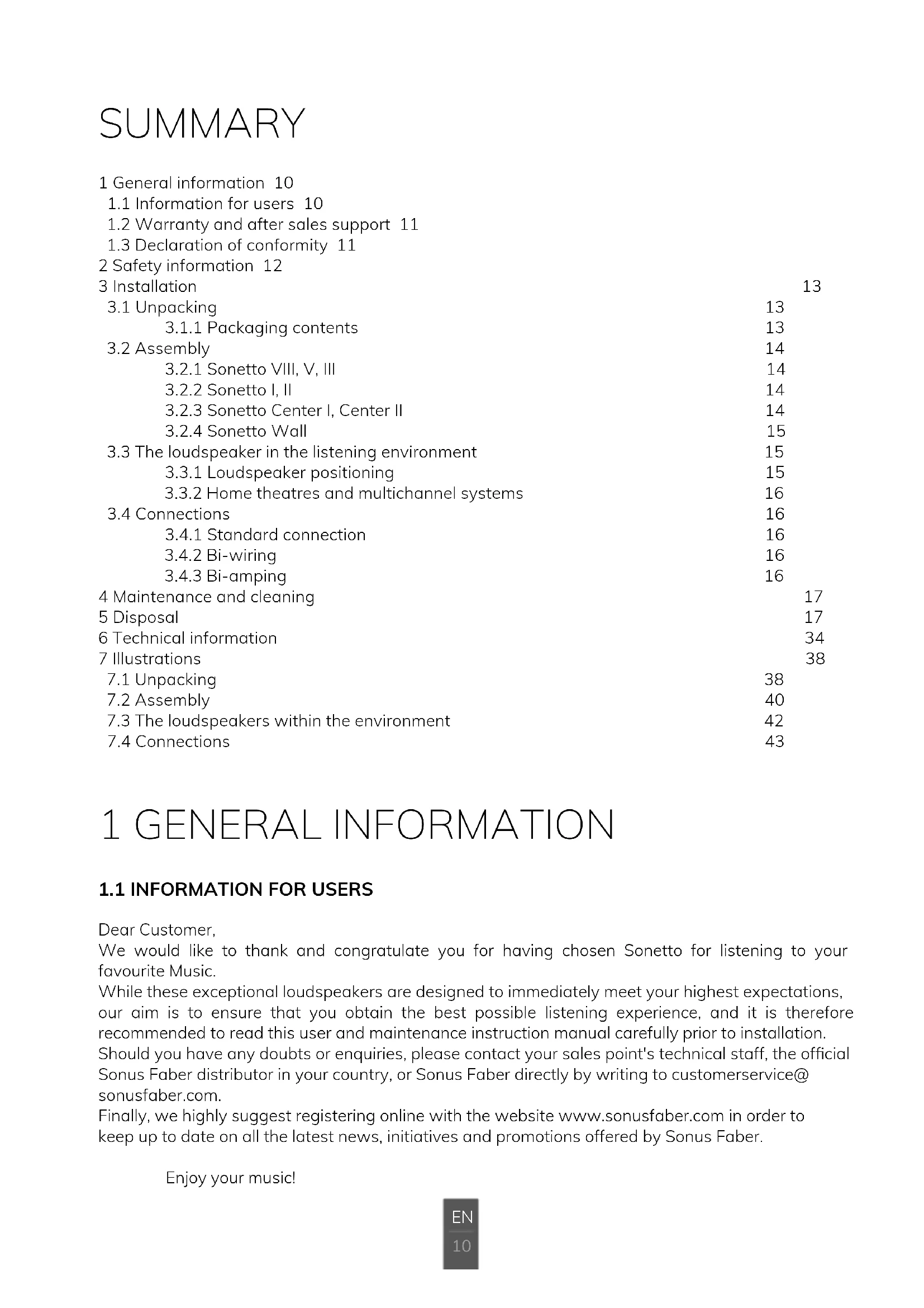 1 GENERAL INFORMATION SUMMARY Dear Customer, We would like to thank and congratulate you for having chosen Sonetto for listening to your favourite Music. While these exceptional loudspeakers are designed to immediately meet your highest expectations, our aim is to ensure that you obtain the best possible listening experience, and it is therefore recommended to read this user and maintenance instruction manual carefully prior to installation. Should you have any doubts or enquiries, please contact your sales point's technical staff, the ofcial Sonus Faber distributor in your country, or Sonus Faber directly by writing to customerservice@ sonusfaber.com. Finally, we highly suggest registering online with the website www.sonusfaber.com in order to keep up to date on all the latest news, initiatives and promotions offered by Sonus Faber. Enjoy your music! 1 General information 10