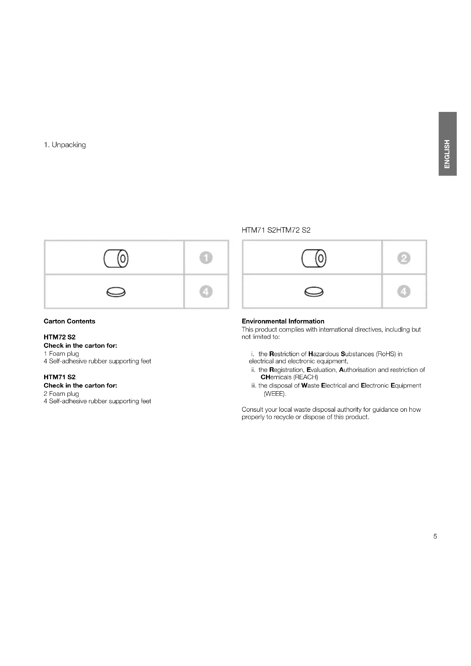 Carton Contents HTM72S2 Check in the carton for: 1 Foam plug 4 Self-adhesive rubber supporting feet HTM71S2 Check in the carton for: 2 Foam plug 4 Self-adhesive rubber supporting feet Environmental Information This product complies with international directives, including but not limited to: