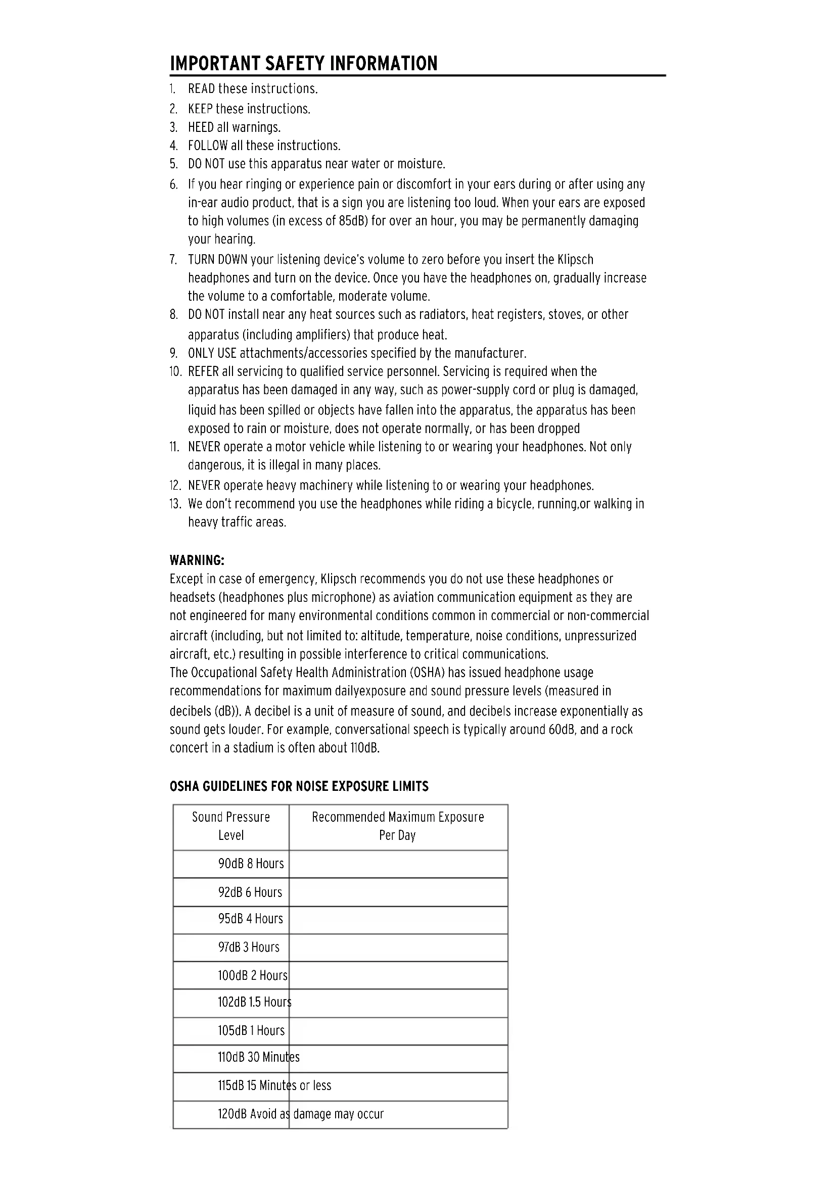 Except in case of emergency, Klipsch recommends you do not use these headphones or headsets (headphones plus microphone) as aviation communication equipment as they are not engineered for many environmental conditions common in commercial or non-commercial aircraft (including, but not limited to: altitude, temperature, noise conditions, unpressurized aircraft, etc.) resulting in possible interference to critical communications. The Occupational Safety Health Administration (OSHA) has issued headphone usage recommendations for maximum dailyexposure and sound pressure levels (measured in decibels (dB)). A decibel is a unit of measure of sound, and decibels increase exponentially as sound gets louder. For example, conversational speech is typically around 60dB, and a rock concert in a stadium is often about 110dB.