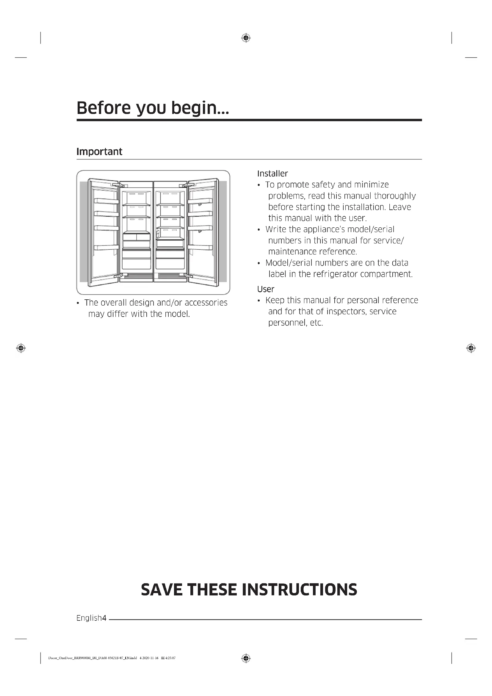 - Keep this manual for personal reference and for that of inspectors, service personnel, etc. Dacor_OneDoor_BRR9000M_IM_DA68-03621B-07_EN.indd 4 2020-11-16 4:25:07SAVE THESE INSTRUCTIONS English 5 Customer-Service Information If You Need Help... If you have questions or problems with installation, contact your Dacor® dealer or the Dacor Customer-Service team. If your Dacor appliance is under warranty, call Dacor Distinctive Service. Have the appliance’s model/serial numbers available when you call. (These numbers are on the data label on the right-hand door jamb inside the refrigerator.) Dacor Distinctive Service (repairs under warranty only) Phone: (833) 353-5483 (U.S.A. and Canada) Monday — Friday 5:00 a.m. to 5:00 p.m. Pacific Time Dacor Customer Service Phone: (833) 353-5483 ex. 2813 (U.S.A. and Canada) Monday — Friday 5:00 a.m. to 5:00 p.m. Pacific Time Web site: www.dacor.com All specifications are subject to change without notice. Dacor assumes no liability for changes to specifications. © 2017 Dacor, all rights reserved. Dacor_OneDoor_BRR9000M_IM_DA68-03621B-07_EN.indd 5 2020-11-16 4:25:07SAVE THESE INSTRUCTIONS English6 Important Safety Instructions The Important safety instructions and warnings in these instructions are not meant to cover all possible problems and conditions that can occur.Use common sense and caution when installing, maintaining, or operating this or any other appliance.Always contact the Dacor Customer Service Team about problems and conditions that you don’t understand. See Customer-Service Information. Safety symbols and labels These alerts are meant to bring attention to important areas in the manual.Whenever you see these symbols or labels, read the message carefully before continuing. DANGER Immediate hazards that WILL result in severe personal injury or death. WARNING Hazards or unsafe practices that COULD result in severe personal injury or death. CAUTION Hazards or unsafe practices that MIGHT result in minor personal injury or property damage. State of California Proposition 65 Warning (US only) WARNING : This product contains chemicals known to the State of California to cause cancer and birth defects or other reproductive harm.Dacor_OneDoor_BRR9000M_IM_DA68-03621B-07_EN.indd 6 2020-11-16 4:25:07SAVE THESE INSTRUCTIONS English 7 WARNING - R600a Refrigerant This appliance contains isobutane refrigerant, R600a, a natural gas with high environmental Compatibility. However it is also flammable. Please adhere to the warnings below :