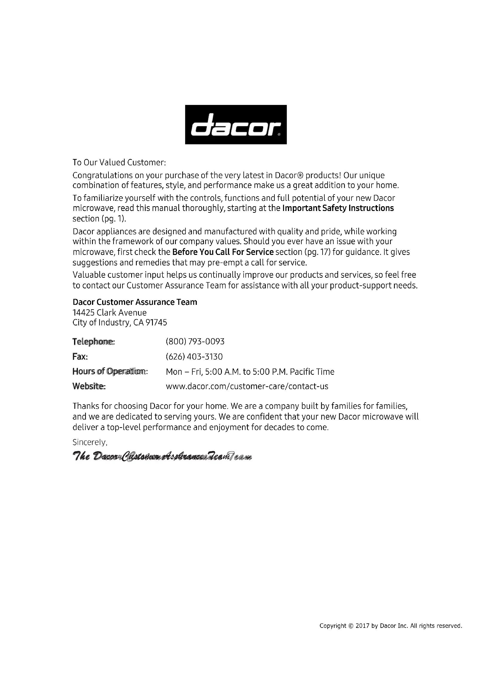 Copyright © 2017 by Dacor Inc. All rights reserved. To Our Valued Customer: Congratulations on your purchase of the very latest in Dacor® products! Our unique combination of features, style, and performance make us a great addition to your home. To familiarize yourself with the controls, functions and full potential of your new Dacor microwave, read this manual thoroughly, starting at the Important Safety Instructions section (pg. 1). Dacor appliances are designed and manufactured with quality and pride, while working within the framework of our company values. Should you ever have an issue with your microwave, first check the Before You Call For Service section (pg. 17) for guidance. It gives suggestions and remedies that may pre-empt a call for service. Valuable customer input helps us continually improve our products and services, so feel free to contact our Customer Assurance Team for assistance with all your product-support needs. Dacor Customer Assurance Team14425 Clark Avenue City of Industry, CA 91745