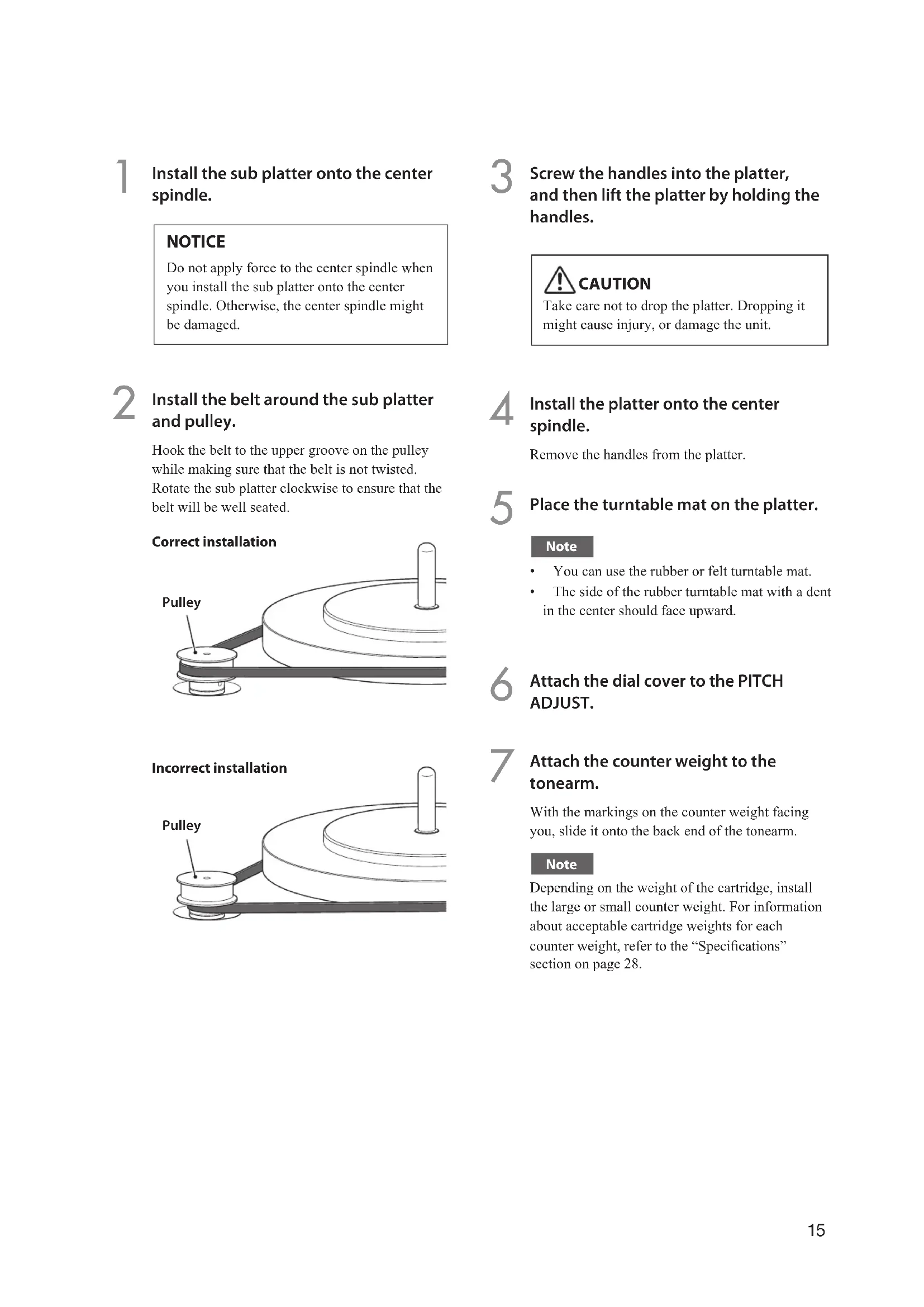 Install the belt around the sub platter and pulley. Hook the belt to the upper groove on the pulley while making sure that the belt is not twisted. Rotate the sub platter clockwise to ensure that the belt will be well seated. Pulley Pulley Correct installation Incorrect installation