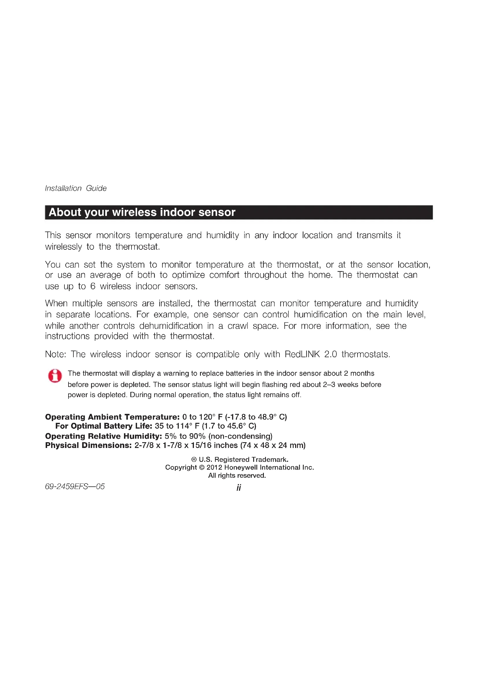 69-2459EFS—05 ® U.S. Registered Trademark. Copyright © 2012 Honeywell International Inc. All rights reserved. About your wireless indoor sensor This sensor monitors temperature and humidity in any indoor location and transmits it wirelessly to the thermostat. You can set the system to monitor temperature at the thermostat, or at the sensor location, or use an average of both to optimize comfort throughout the home. The thermostat can use up to 6 wireless indoor sensors. When multiple sensors are installed, the thermostat can monitor temperature and humidity in separate locations. For example, one sensor can control humidication on the main level, while another controls dehumidication in a crawl space. For more information, see the instructions provided with the thermostat. Note: The wireless indoor sensor is compatible only with RedLINK 2.0 thermostats. Operating Ambient Temperature: 0 to 120° F (-17.8 to 48.9° C) For Optimal Battery Life: 35 to 114° F (1.7 to 45.6° C) Operating Relative Humidity: 5% to 90% (non-condensing) Physical Dimensions: 2-7/8 x 1-7/8 x 15/16 inches (74 x 48 x 24 mm) The thermostat will display a warning to replace batteries in the indoor sensor about 2 months before power is depleted. The sensor status light will begin flashing red about 2–3 weeks before power is depleted. During normal operation, the status light remains off.Wireless Indoor Sensor