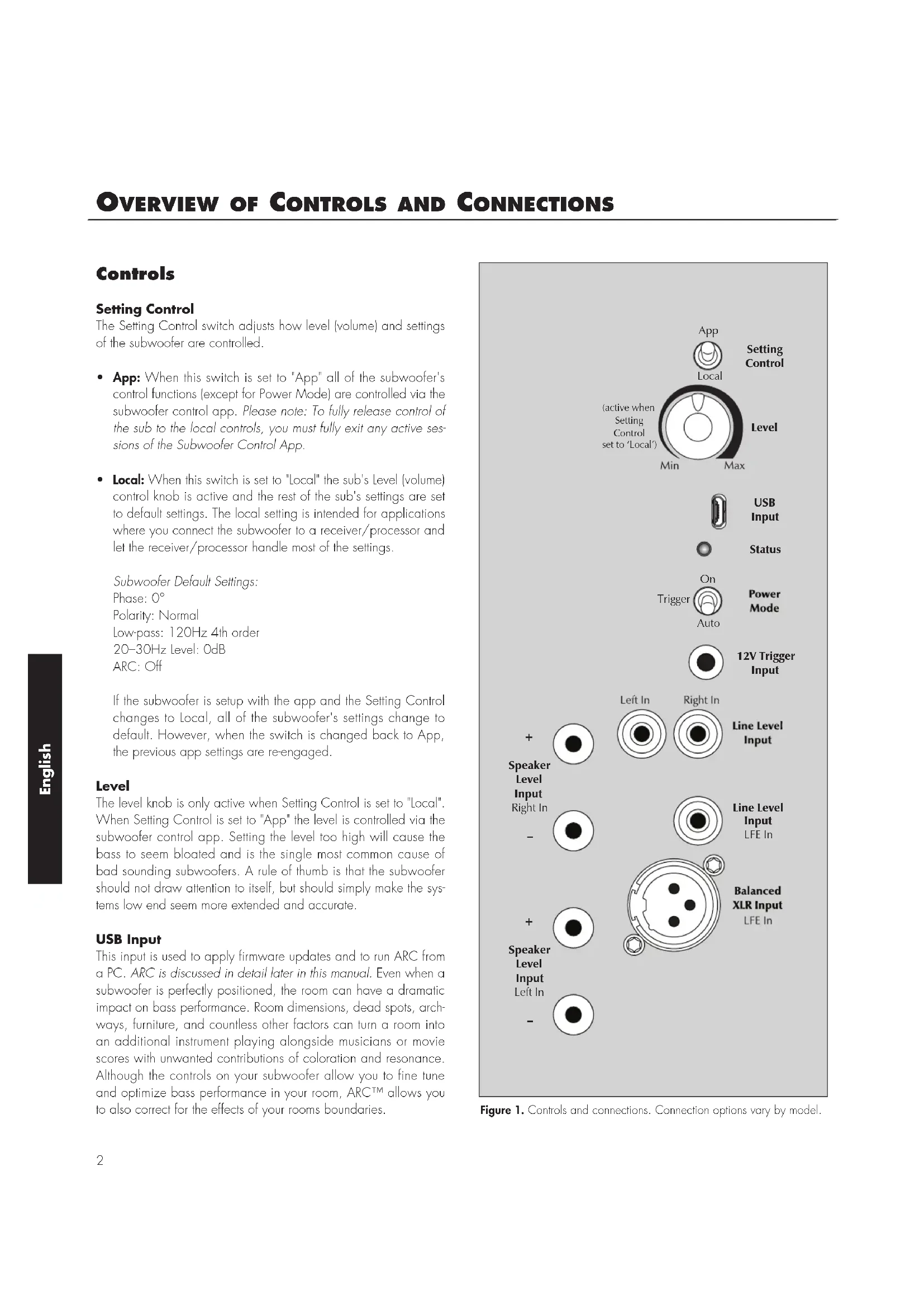 - Local: When this switch is set to "Local" the sub's Level (volume) control knob is active and the rest of the sub's settings are set to default settings. The local setting is intended for applications where you connect the subwoofer to a receiver/processor and let the receiver/processor handle most of the settings. Subwoofer Default Settings: Phase: 0° Polarity: Normal Low-pass: 120Hz 4th order 20–30Hz Level: 0dB ARC: Off If the subwoofer is setup with the app and the Setting Control changes to Local, all of the subwoofer's settings change to default. However, when the switch is changed back to App, the previous app settings are re-engaged. Level The level knob is only active when Setting Control is set to "Local". When Setting Control is set to "App" the level is controlled via the subwoofer control app. Setting the level too high will cause the bass to seem bloated and is the single most common cause of bad sounding subwoofers. A rule of thumb is that the subwoofer should not draw attention to itself, but should simply make the sys- tems low end seem more extended and accurate. USB Input This input is used to apply firmware updates and to run ARC from a PC. ARC is discussed in detail later in this manual. Even when a subwoofer is perfectly positioned, the room can have a dramatic impact on bass performance. Room dimensions, dead spots, arch- ways, furniture, and countless other factors can turn a room into an additional instrument playing alongside musicians or movie scores with unwanted contributions of coloration and resonance. Although the controls on your subwoofer allow you to fine tune and optimize bass performance in your room, ARC™ allows you to also correct for the effects of your rooms boundaries. overview of Controls and ConneCtions Figure 1. Controls and connections. Connection options vary by model. SpeakerLevelInput Left In SpeakerLevelInput Right InStatus USB InputLine LevelInputLFE In