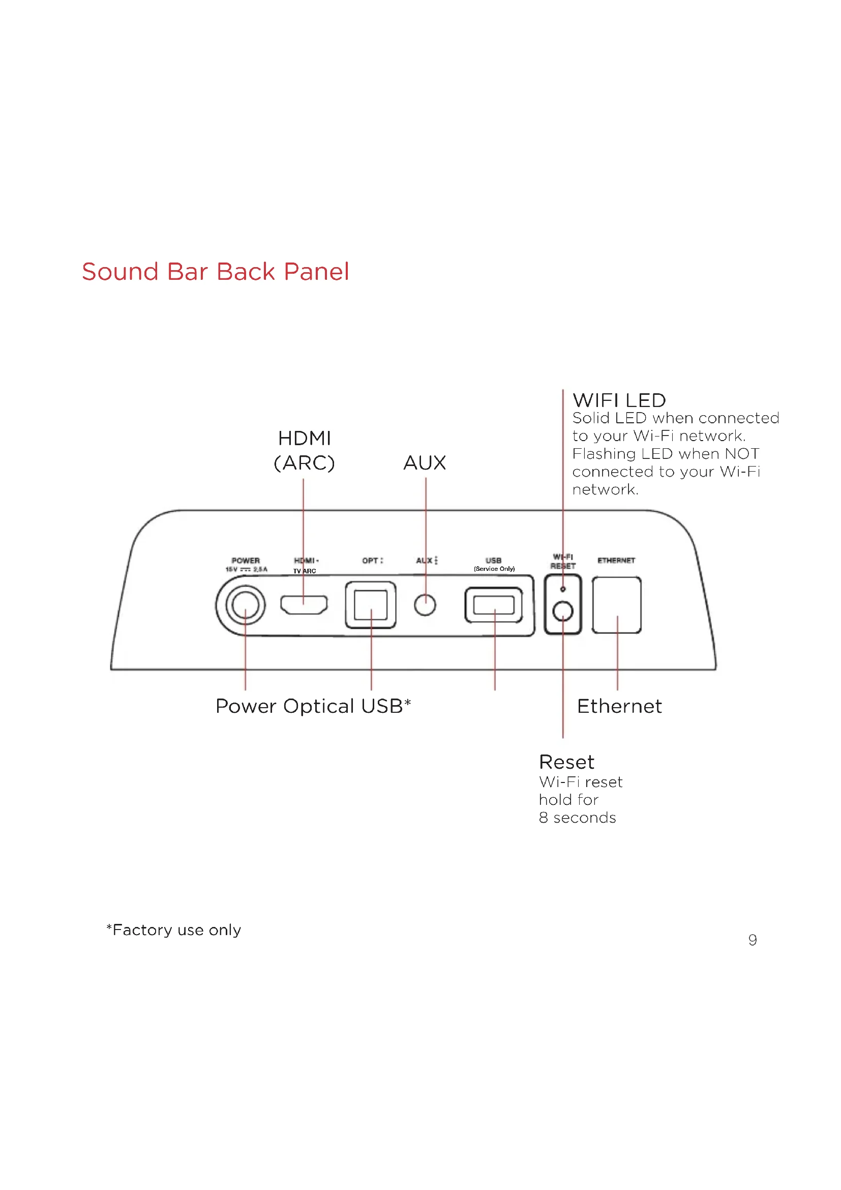 Remote Control Power on/o Mute *Play/Pause Sport Mode AUX VoiceAdjust Up/Down Optical Night Eect HDMI *Previous Track *For music only Bass Up/Down Movie Mode *Next Track Master Volume Up/Down Music Mode8 Sound Bar Top Panel Power on/o Source Master Volume Down Master Volume Up Night Eect Bluetooth9 Sound Bar Back Panel Power Optical USB* HDMI (ARC) AUX WIFI LED Solid LED when connected to your Wi-Fi network. Flashing LED when NOT connected to your Wi-Fi network. Reset Wi-Fi reset hold for 8 seconds Ethernet TV ARC (Service Only) *Factory use only10 Sound Bar LEDs The MagniFi Mini has a vertical row of LED lights that provide status indications, like source, volume and listening modes. HDMI (TV ARC) OPT AUX Bluetooth Google Cast Dolby Content Night Eect