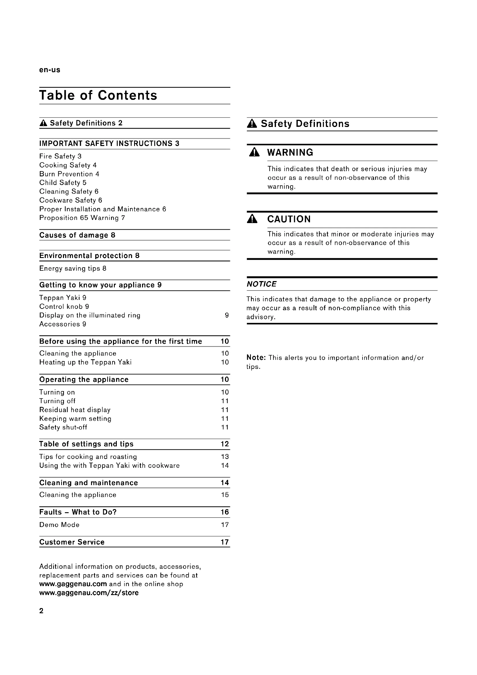 *DJJHQDX Use and care manual 2 Notice d’utilisation 18 Manual de instrucciones 35 VP 414 611 Teppan Yaki2 en-us Table of Contents Use and care manual 9 Safety Definitions 2IMPORTANT SAFETY INSTRUCTIONS 3Fire Safety 3Cooking Safety 4Burn Prevention 4Child Safety 5Cleaning Safety 6Cookware Safety 6Proper Installation and Maintenance 6Proposition 65 Warning 7Causes of damage 8Environmental protection 8Energy saving tips 8Getting to know your appliance 9Teppan Yaki 9Control knob 9Display on the illuminated ring 9Accessories 9Before using the appliance for the first time 10Cleaning the appliance 10Heating up the Teppan Yaki 10Operating the appliance 10Turning on 10Turning off 11Residual heat display 11Keeping warm setting 11Safety shut-off 11Table of settings and tips 12Tips for cooking and roasting 13Using the with Teppan Yaki with cookware 14Cleaning and maintenance 14Cleaning the appliance 15Faults – What to Do? 16Demo Mode 17Customer Service 17 Additional information on products, accessories, replacement parts and services can be found at www.gaggenau.com and in the online shop www.gaggenau.com/zz/store 9 Safety Definitions Safety Definitions 9 WARNING This indicates that death or serious injuries may occur as a result of non-observance of this warning. 9 CAUTION This indicates that minor or moderate injuries may occur as a result of non-observance of this warning.NOTICEThis indicates that damage to the appliance or property may occur as a result of non-compliance with this advisory.Note: This alerts you to important information and/or tips.3