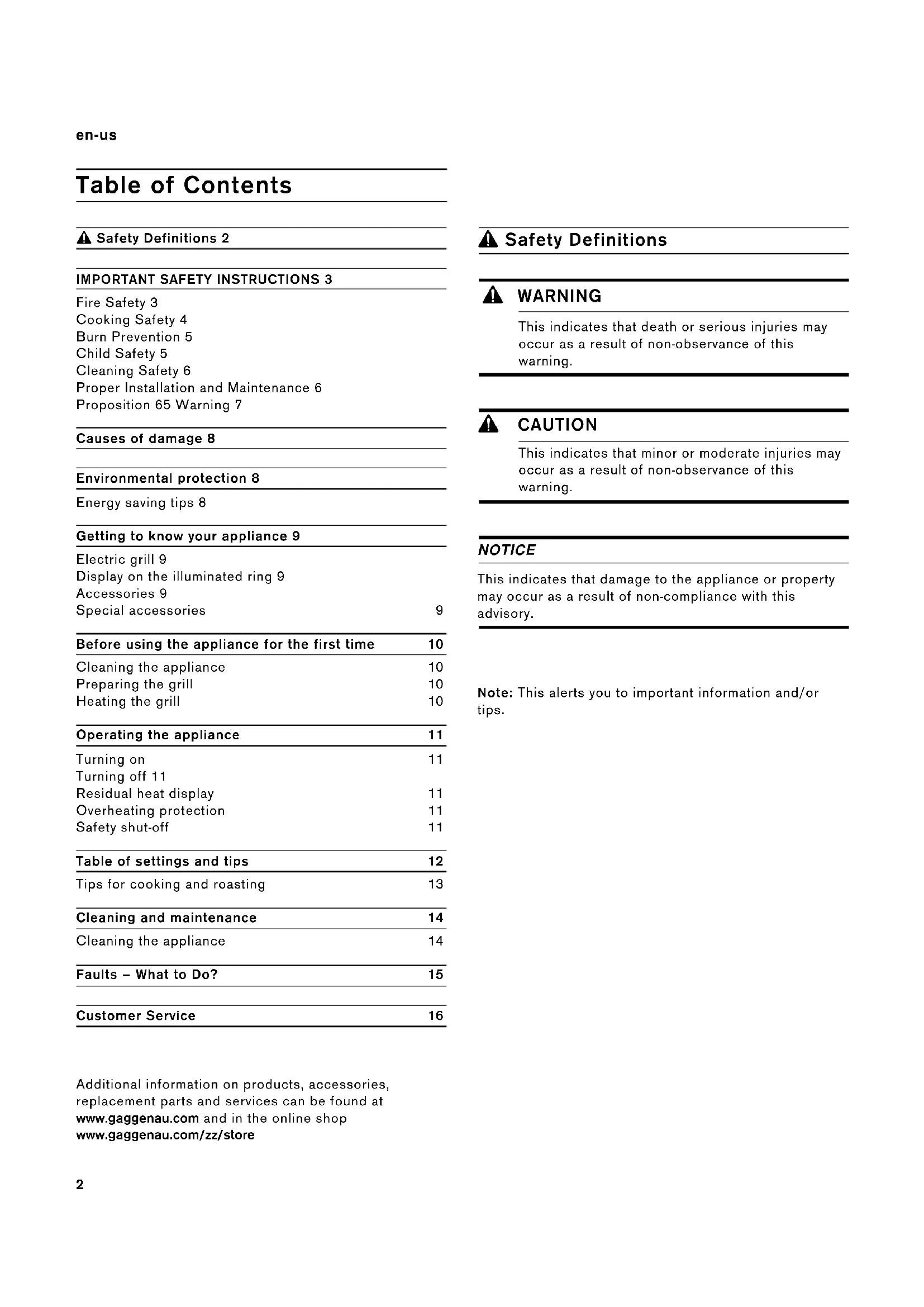 *DJJHQDX Use and care manual 2 Notice d’utilisation 17 Manual de instrucciones 33 VR 230 620 Electric grill Gril électrique Grill eléctrico2 en-us Table of Contents Use and care manual 9 Safety Definitions 2IMPORTANT SAFETY INSTRUCTIONS 3Fire Safety 3Cooking Safety 4Burn Prevention 5Child Safety 5Cleaning Safety 6Proper Installation and Maintenance 6Proposition 65 Warning 7Causes of damage 8Environmental protection 8Energy saving tips 8Getting to know your appliance 9Electric grill 9Display on the illuminated ring 9Accessories 9Special accessories 9Before using the appliance for the first time 10Cleaning the appliance 10Preparing the grill 10Heating the grill 10Operating the appliance 11Turning on 11Turning off 11Residual heat display 11Overheating protection 11Safety shut-off 11Table of settings and tips 12Tips for cooking and roasting 13Cleaning and maintenance 14Cleaning the appliance 14Faults – What to Do? 15Customer Service 16 Additional information on products, accessories, replacement parts and services can be found at www.gaggenau.com and in the online shop www.gaggenau.com/zz/store 9 Safety Definitions Safety Definitions 9 WARNING This indicates that death or serious injuries may occur as a result of non-observance of this warning. 9 CAUTION This indicates that minor or moderate injuries may occur as a result of non-observance of this warning.NOTICEThis indicates that damage to the appliance or property may occur as a result of non-compliance with this advisory.Note: This alerts you to important information and/or tips.3