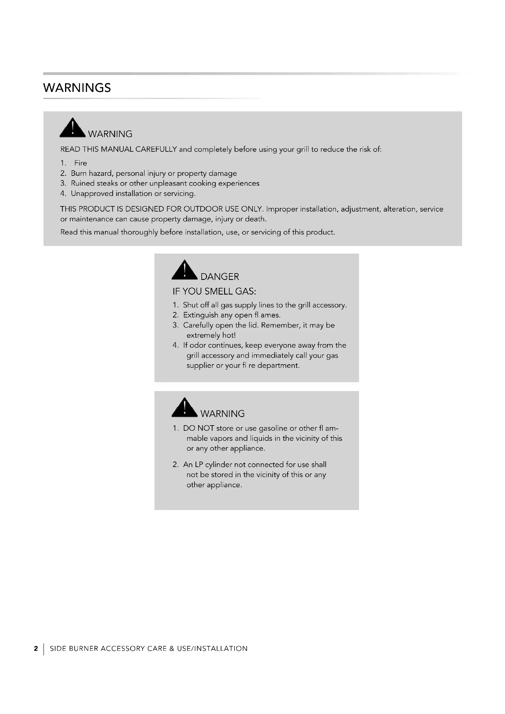 - Do not operate any outdoor cooking gas appliance with a damaged cord, plug, or after the appliance malfunctions or has been damaged in any manner. Contact the manufacturer for repair.SIDE BURNER ACCESSORY CARE & USE/INSTALLATION