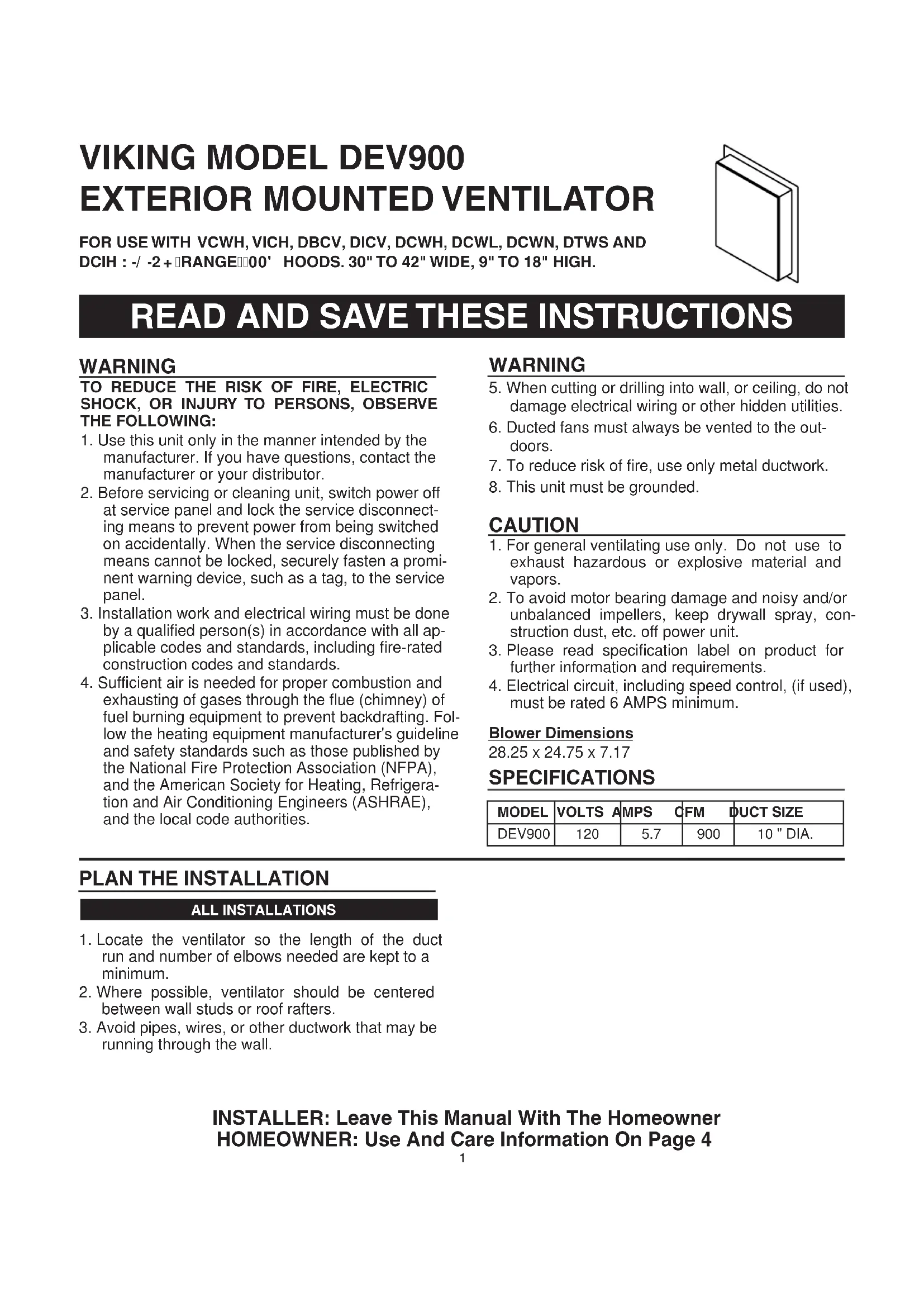 DEV900 120 5.7 900 10 " DIA. SPECIFICATIONS INSTALLER: Leave This Manual With The Homeowner HOMEOWNER: Use And Care Information On Page 4