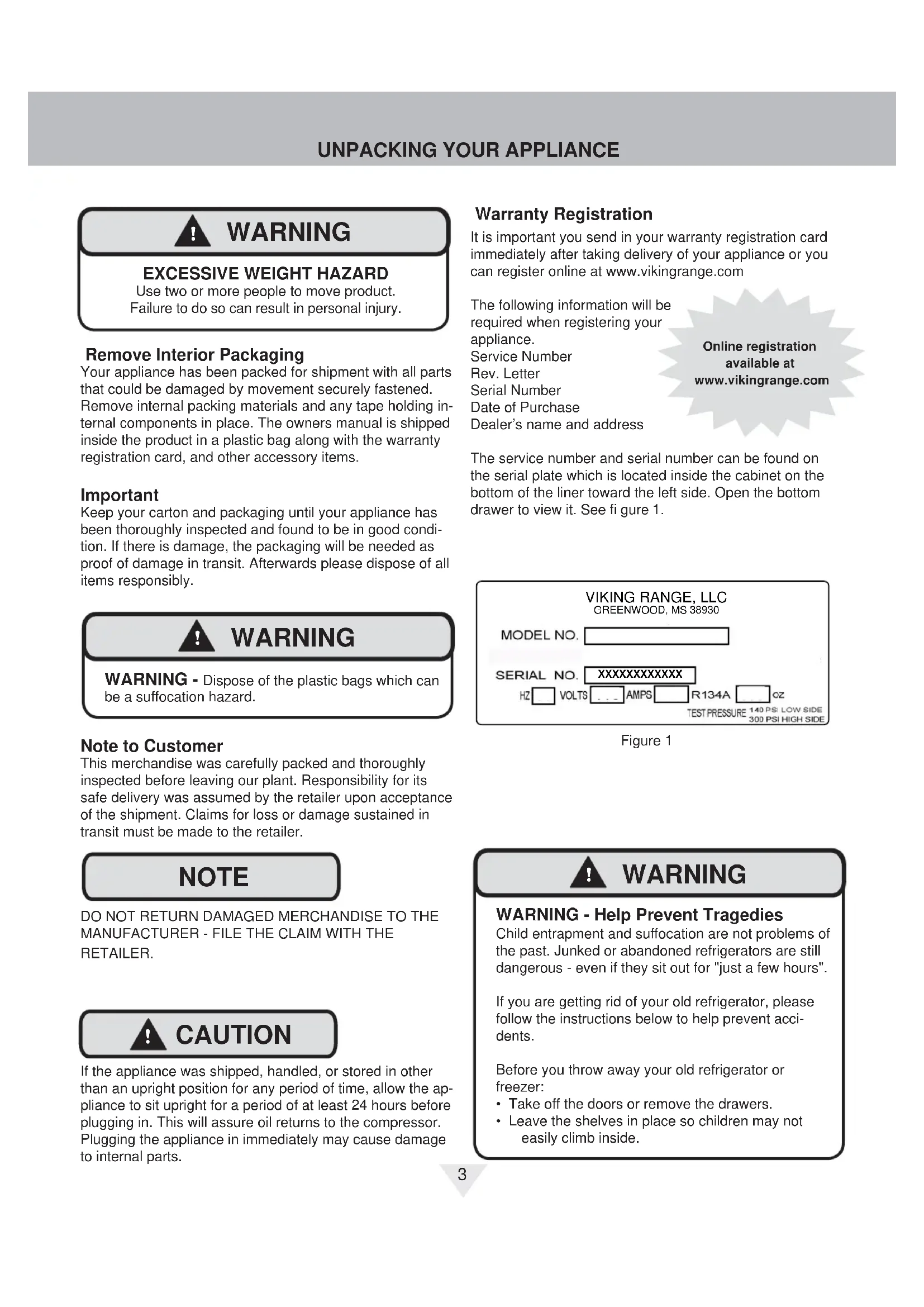 Use two or more people to move product.Failure to do so can result in personal injury. Remove Interior Packaging Your appliance has been packed for shipment with all parts that could be damaged by movement securely fastened. Remove internal packing materials and any tape holding in-ternal components in place. The owners manual is shipped inside the product in a plastic bag along with the warranty registration card, and other accessory items. Important Keep your carton and packaging until your appliance has been thoroughly inspected and found to be in good condi-tion. If there is damage, the packaging will be needed as proof of damage in transit. Afterwards please dispose of all items responsibly. Note to Customer This merchandise was carefully packed and thoroughly inspected before leaving our plant. Responsibility for its safe delivery was assumed by the retailer upon acceptance of the shipment. Claims for loss or damage sustained in transit must be made to the retailer.DO NOT RETURN DAMAGED MERCHANDISE TO THE MANUFACTURER - FILE THE CLAIM WITH THE RETAILER.If the appliance was shipped, handled, or stored in other than an upright position for any period of time, allow the ap-pliance to sit upright for a period of at least 24 hours before plugging in. This will assure oil returns to the compressor. Plugging the appliance in immediately may cause damage to internal parts.It is important you send in your warranty registration card immediately after taking delivery of your appliance or you can register online at www.vikingrange.com The following information will be required when registering your appliance.Service NumberRev. LetterSerial NumberDate of PurchaseDealer’s name and addressThe service number and serial number can be found on the serial plate which is located inside the cabinet on the bottom of the liner toward the left side. Open the bottom drawer to view it. See fi gure 1. Warranty Registration Online registration available at www.vikingrange.comFigure 1