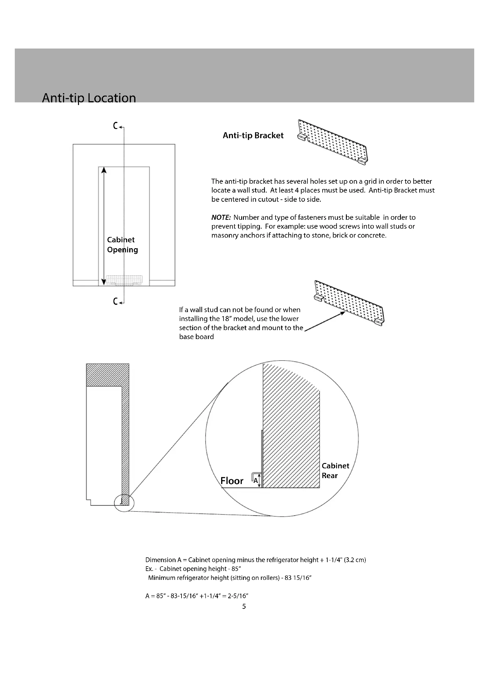 Cabinet Opening Dimension A = Cabinet opening minus the refrigerator height + 1-1/4" (3.2 cm)Ex. - Cabinet opening height - 85” Minimum refrigerator height (sitting on rollers) - 83 15/16”A = 85” - 83-15/16” +1-1/4” = 2-5/16” Anti-tip Bracket The anti-tip bracket has several holes set up on a grid in order to better locate a wall stud. At least 4 places must be used. Anti-tip Bracket must be centered in cutout - side to side. NOTE: Number and type of fasteners must be suitable in order to prevent tipping. For example: use wood screws into wall studs or masonry anchors if attaching to stone, brick or concrete. If a wall stud can not be found or when installing the 18” model, use the lower section of the bracket and mount to the base board6 Preparing Units for Installation Before removing units from pallet, remove the side trim from each unit, install center trim brackets and connection heater (steps 1 thru 4). Make sure units are unplugged and powered o . Look closely at the trim already installed on the unit. If the trim resembles that in Trim A, it will need to be removed and replaced with Trim B. If the trim already resembles Trim B, leave as is.