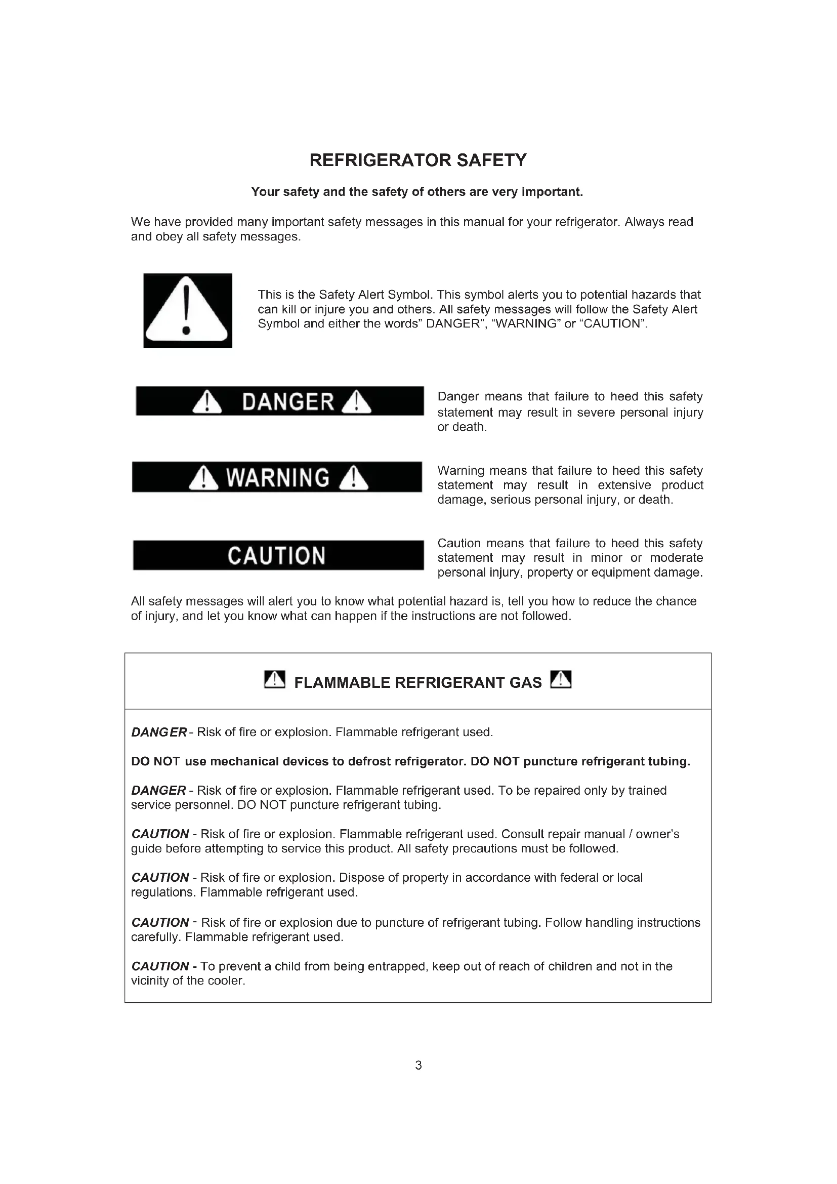 our safety and the safety of others are very important. We have provided many important safety messages in this manual for your refrigerator. Always read and obey all safety messages. This is the Safety Alert Symbol. This symbol alerts you to potential hazards that can kill or injure you and others. All safety messages will follow the Safety Alert Symbol and either the words” DANGER”, “WARNING” or “CAUTION”. Danger means that failure to heed this safety statement may result in severe personal injury or death. Warning means that failure to heed this safety statement may result in extensive product damage, serious personal injury, or death. Caution means that failure to heed this safety statement may result in minor or moderate personal injury, property or equipment damage. All safety messages will alert you to know what potential hazard is, tell you how to reduce the chance of injury, and let you know what can happen if the instructions are not followed.
