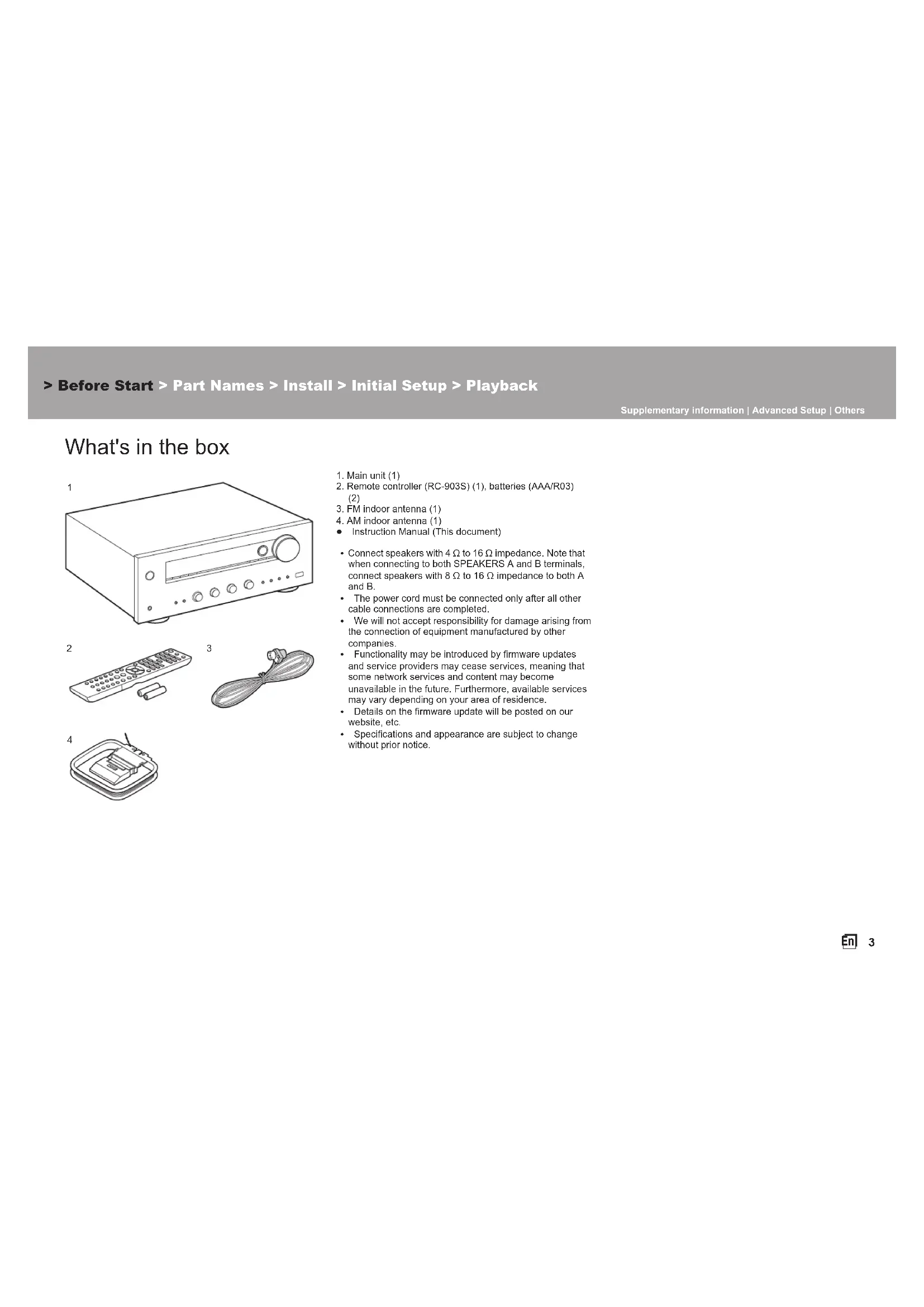 0 Connect speakers with 4 ≠ to 16 ≠ impedance. Note that when connecting to both SPEAKERS A and B terminals, connect speakers with 8 ≠ to 16 ≠ impedance to both A and B.0 The power cord must be connected only after all other cable connections are completed.0 We will not accept responsibility for damage arising from the connection of equipment manufactured by other companies.0 Functionality may be introduced by firmware updates and service providers may cease services, meaning that some network services and content may become unavailable in the future. Furthermore, available services may vary depending on your area of residence.0 Details on the firmware update will be posted on our website, etc.0 Specifications and appearance are subject to change without prior notice. > Before Start > Part Names > Install > Initial Setup > Playback Supplementary information | Advanced Setup | Others