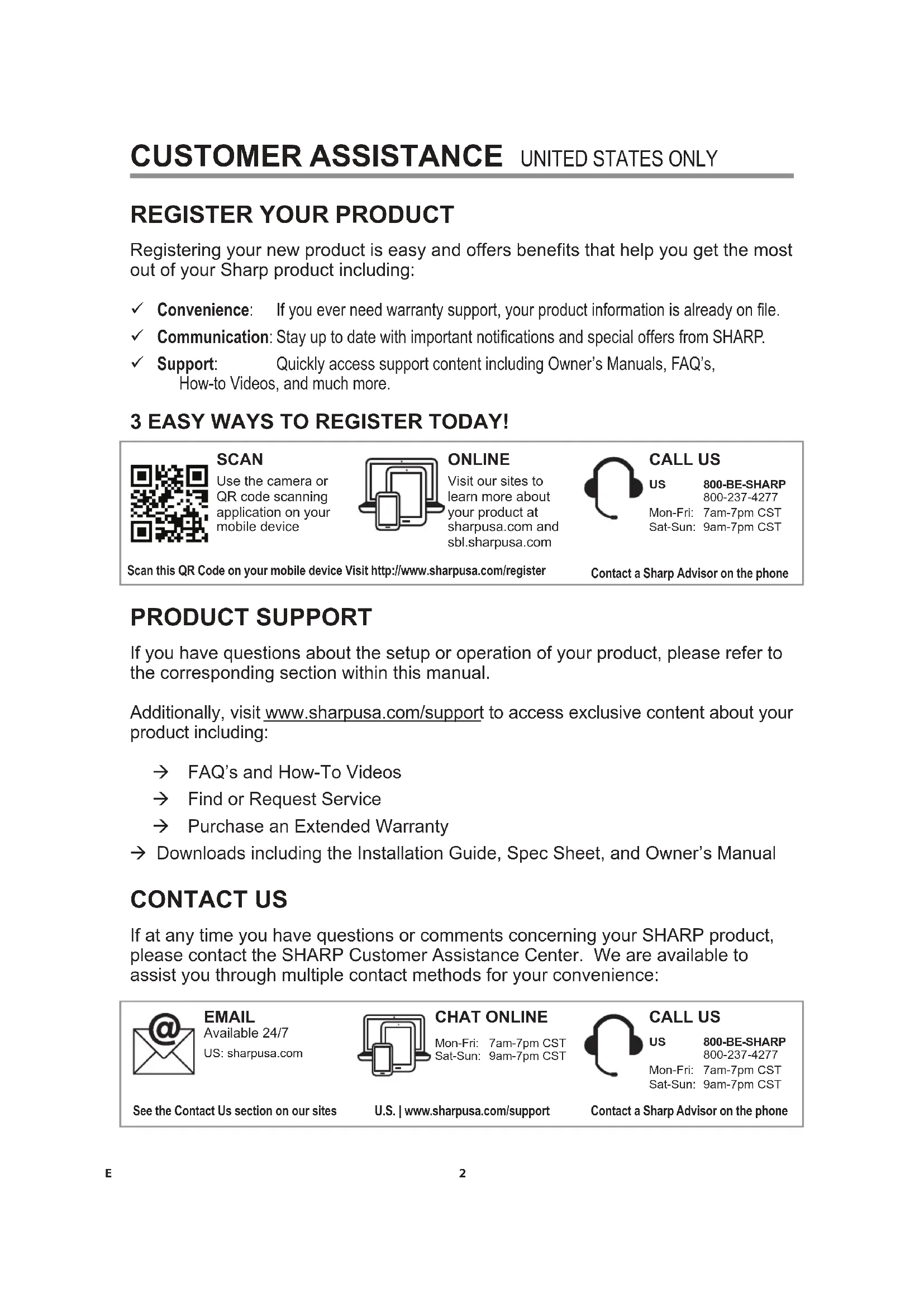 Registering your new product is easy and offers benets that help you get the most out of your Sharp product including: 9 Convenience: Ifyoueverneedwarrantysupport,yourproductinformationisalreadyonle. 9 Communication:StayuptodatewithimportantnoticationsandspecialoffersfromSHARP. 9 Support: Quickly access support content including Owner’s Manuals, FAQ’s, How-toVideos,andmuchmore. 3 EASY WAYS TO REGISTER TODAY! PRODUCT SUPPORT If you have questions about the setup or operation of your product, please refer to the corresponding section within this manual.Additionally, visit www.sharpusa.com/support to access exclusive content about your product including: Æ FAQ’s and How-To Videos Æ Find or Request Service Æ Purchase an Extended Warranty Æ Downloads including the Installation Guide, Spec Sheet, and Owner’s Manual CONTACT US If at any time you have questions or comments concerning your SHARP product, please contact the SHARP Customer Assistance Center. We are available to assist you through multiple contact methods for your convenience:Scan this QR Code on your mobile device Visit http://www.sharpusa.com/registerONLINEVisit our sites to learn more about your product at sharpusa.com and sbl.sharpusa.com See the Contact Us section on our sites U.S. | www.sharpusa.com/support Contact a Sharp Advisor on the phone Contact a Sharp Advisor on the phoneCALL US US 800-BE-SHARP 800-237-4277 Mon-Fri: 7am-7pm CST Sat-Sun: 9am-7pm CSTCALL US US 800-BE-SHARP 800-237-4277 Mon-Fri: 7am-7pm CST Sat-Sun: 9am-7pm CSTEMAIL Available 24/7US: sharpusa.com CHAT ONLINE Mon-Fri: 7am-7pm CST Sat-Sun: 9am-7pm CST SCAN Use the camera or QR code scanning application on your mobile device2E
