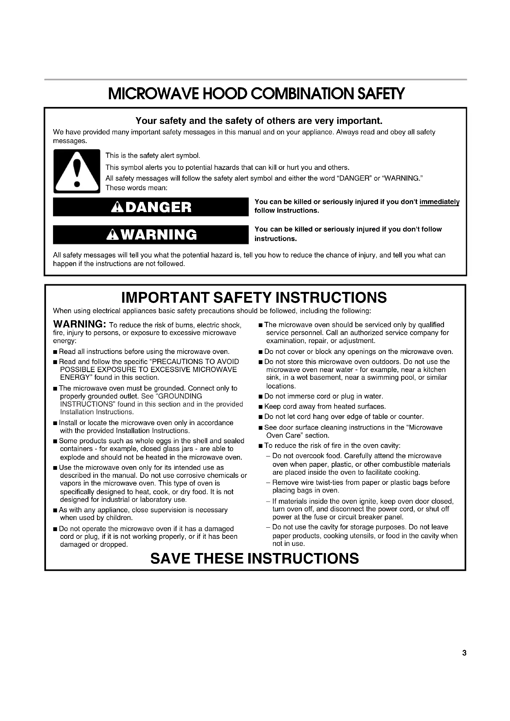 You can be killed or seriously injured if you don't immediately You can be killed or seriously injured if you don'tfollow All safety messages will tell you what the potential hazard is, tell you how to reduce the chance of injury, and tell you what can happen if the instructions are not followed. Your safety and the safety of others are very important. We have provided many important safety messages in this manual and on your appliance. Always read and obey all safety messages.This is the safety alert symbol.This symbol alerts you to potential hazards that can kill or hurt you and others.All safety messages will follow the safety alert symbol and either the word “DANGER” or “WARNING.”These words mean:follow instructions.instructions. DANGER WARNING When using electrical appliances basic safety precautions should be followed, including the following: