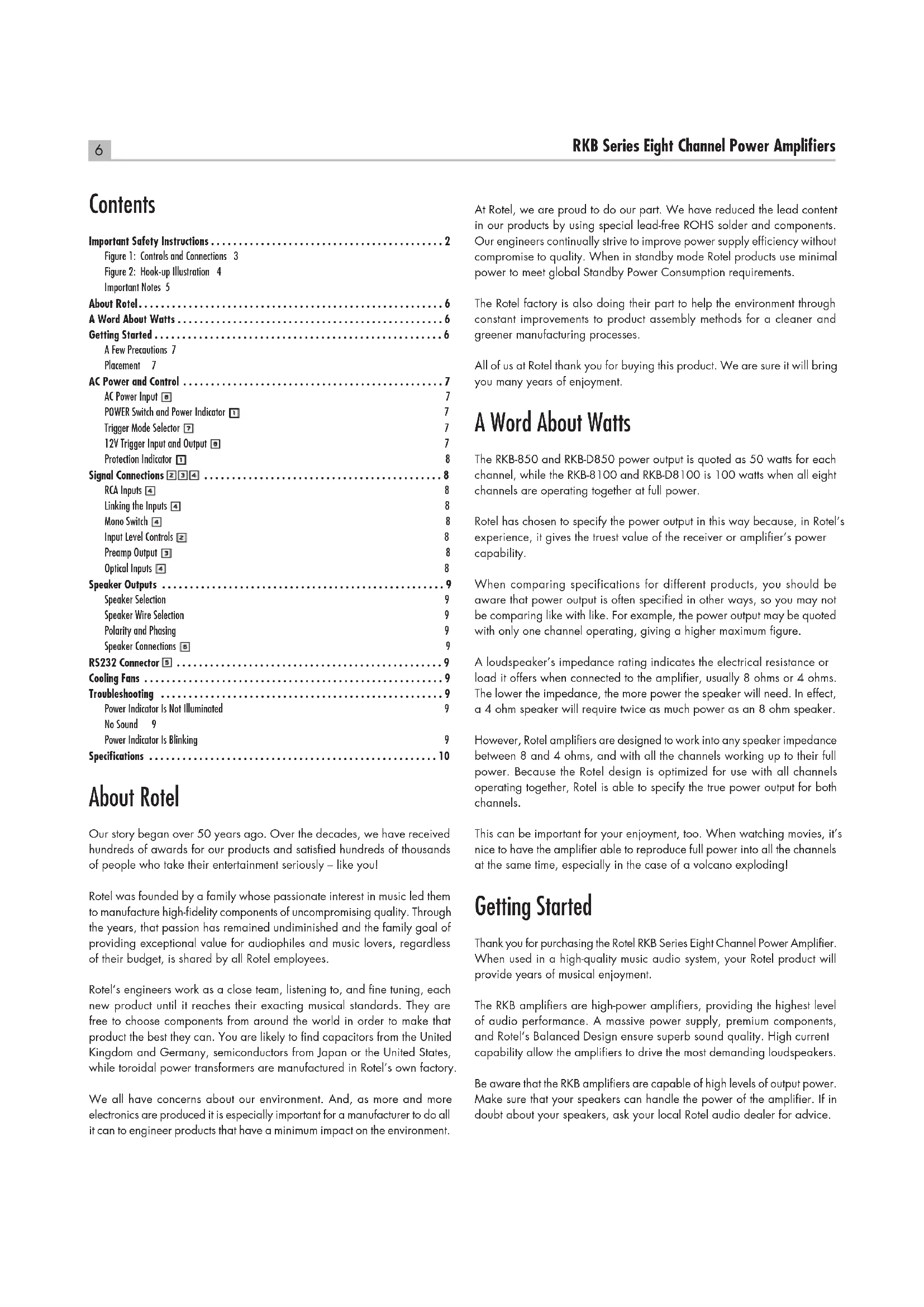 The RKB amplifier can be controlled via RS232 for integration with automation systems. The RS232 input accepts a standard straight DB-9 Male-to-Female cable.For additional information on the connections, software, and operating codes for computer control of the RKB amplifier, contact your authorized Rotel dealer. Cooling Fans The RKB amplifier includes 2 cooling fans to help exhaust the heat generated by the power supply and amplifier modules. These fans will operate at NORMAL speed when the RKB is powered on and not in STANDBY mode. The fans will automatic switch to HIGH SPEED mode when required by internal thermostat sensors. NOTE: Depending on the installation location the cooling fans may need to be cleaned periodically to ensure proper ventilation. Please contact your authorized Rotel dealer for more information. Troubleshooting Most difficulties in audio systems are the result of incorrect connections, or improper control settings. If you encounter problems, isolate the area of the difficulty, check the control settings, determine the cause of the fault and make the necessary changes. If you are unable to get sound from the RKB amplifier, refer to the suggestions for the following conditions: Power Indicator Is Not Illuminated No main power to the RKB amplifier. Check AC power connections at the amplifier and the AC outlet. Check the front panel power switch. Make sure that it is set to the ON position. If using 12V trigger power-on, make sure that a trigger signal is present at rear panel 12V TRIGGER IN connector. No Sound If the amplifier is getting AC power, but is producing no sound, check the POWER INDICATOR on the front panel. If blinking, see below. If not, check all of your connections and control settings on associated components. Power Indicator Is Blinking The front panel POWER INDICATOR is blinking when the amplifier protection circuits have shut off the amplifier. Typically, this occurs only when the ventilation openings are blocked, when there is faulty speaker wiring, or after a period of extreme use. Turn off the system and wait for the amplifier to cool. Then push the front panel power switch in and out to reset the protection devices. If the problem is not corrected or reoccurs, there is a problem with the system or the amplifier itself.10 RKB Series Eight Channel Power Amplifiers Specifications RKB-850 Continuous Power Output 50 watts / channel (8 ch driven) (20 Hz - 20k Hz, <0.1% THD, 8 ohms) Total Harmonic Distortion < 0.08% (20 Hz - 20k Hz, 8 ohms) Intermodulation Distortion < 0.08% (60 Hz : 7k Hz, 4:1) Damping Factor > 150 Input Impedance / Sensitivity 100k ohms / 0.6 V Amplifier Gain 30 dB Frequency Response 20 Hz - 20k Hz, + 0 dB/ -1.4 dB Signal to Noise Ratio (IHF A) 108 dB Crosstalk / Separation > 60 dB Speaker Impedance 4 ohms minimum Power Requirements: USA: 120 Volts, 60 Hz EC: 230 Volts, 50 Hz Power Consumption 150 watts Idle: 40 watts Standby: < 0.5 watts BTU (4 ohms, 1/8th power) 180 BTU/h Dimensions (W x H x D) 430 x 97 x 424 mm (17 x 3