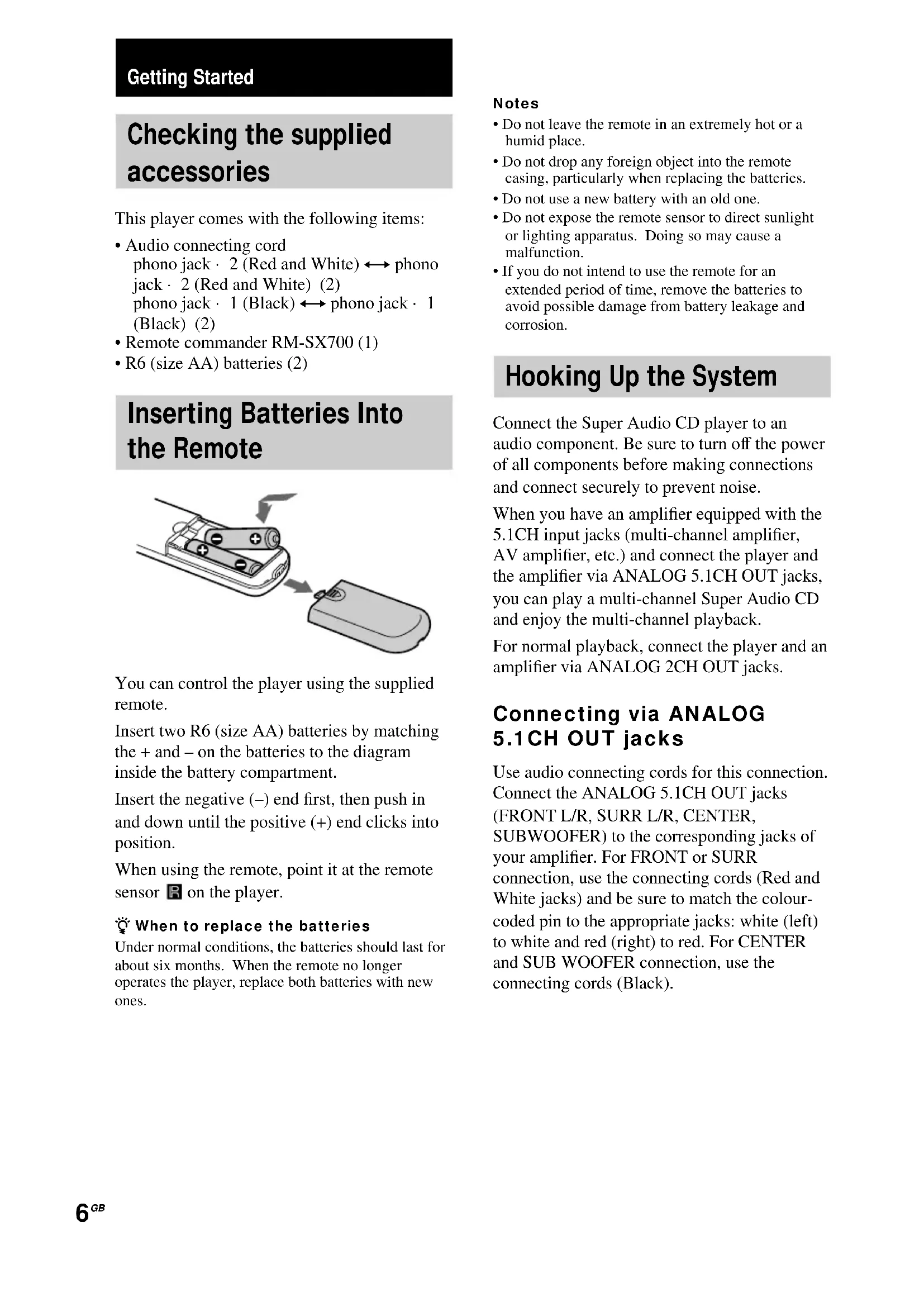 - If you do not intend to use the remote for an extended period of time, remove the batteries to avoid possible damage from battery leakage and corrosion. Hooking Up the System Connect the Super Audio CD player to an audio component. Be sure to turn off the power of all components before making connections and connect securely to prevent noise. When you have an amplifier equipped with the 5.1CH input jacks (multi-channel amplifier, AV amplifier, etc.) and connect the player and the amplifier via ANALOG 5.1CH OUT jacks, you can play a multi-channel Super Audio CD and enjoy the multi-channel playback. For normal playback, connect the player and an amplifier via ANALOG 2CH OUT jacks. Connecting via ANALOG 5.1CH OUT jacks Use audio connecting cords for this connection. Connect the ANALOG 5.1CH OUT jacks (FRONT L/R, SURR L/R, CENTER, SUBWOOFER) to the corresponding jacks of your amplifier. For FRONT or SURR connection, use the connecting cords (Red and White jacks) and be sure to match the colour- coded pin to the appropriate jacks: white (left) to white and red (right) to red. For CENTER and SUB WOOFER connection, use the connecting cords (Black).Getting Started