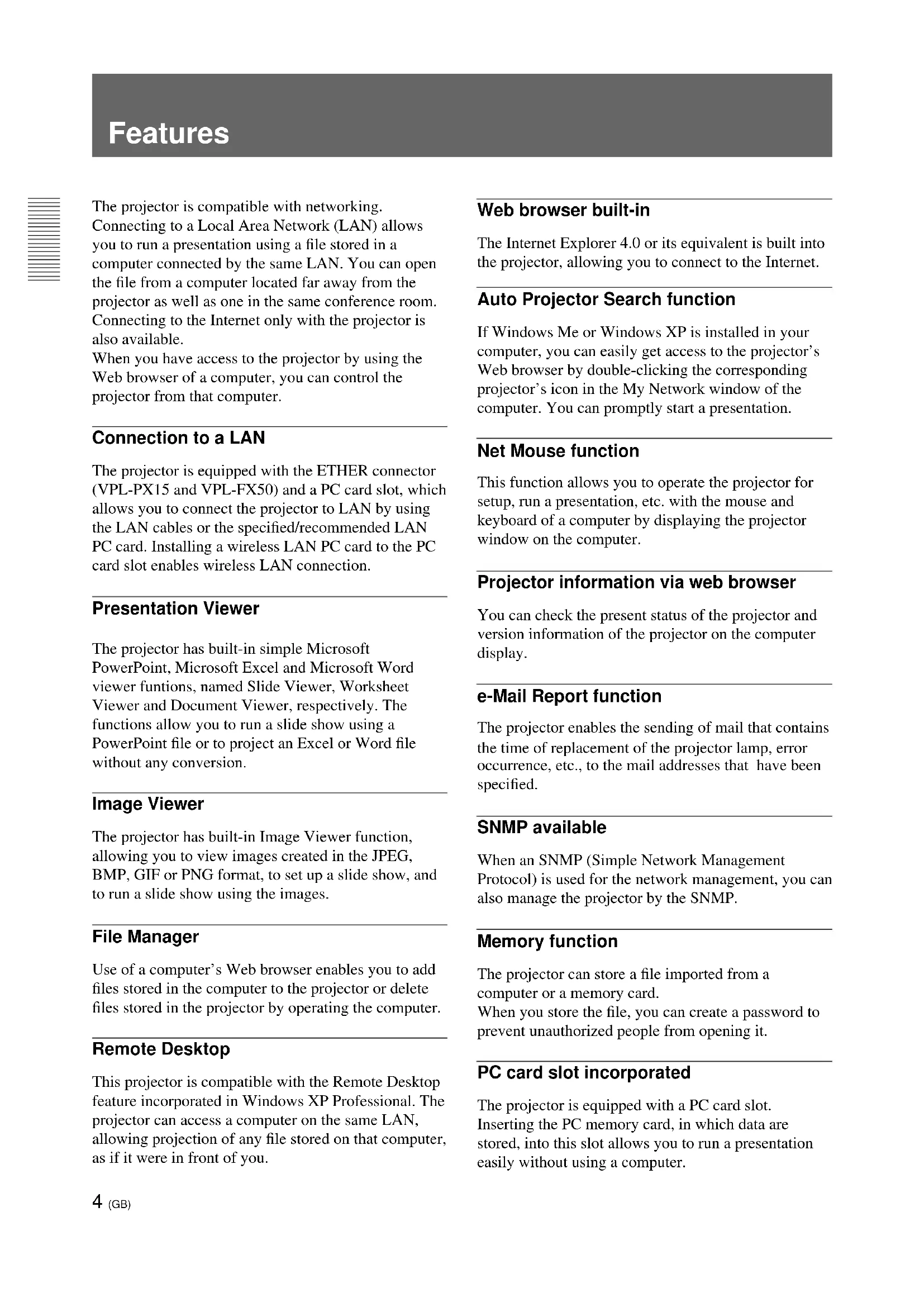 - ORiNOCO is a registered trademark of Agere Systems.4 (GB) Features Web browser built-in The Internet Explorer 4.0 or its equivalent is built into the projector, allowing you to connect to the Internet. Auto Projector Search function If Windows Me or Windows XP is installed in your computer, you can easily get access to the projector’s Web browser by double-clicking the corresponding projector’s icon in the My Network window of the computer. You can promptly start a presentation. Net Mouse function This function allows you to operate the projector for setup, run a presentation, etc. with the mouse and keyboard of a computer by displaying the projector window on the computer. Projector information via web browser You can check the present status of the projector and version information of the projector on the computer display. e-Mail Report function The projector enables the sending of mail that contains the time of replacement of the projector lamp, error occurrence, etc., to the mail addresses that have been specified. SNMP available When an SNMP (Simple Network Management Protocol) is used for the network management, you can also manage the projector by the SNMP. Memory function The projector can store a file imported from a computer or a memory card. When you store the file, you can create a password to prevent unauthorized people from opening it. PC card slot incorporated The projector is equipped with a PC card slot. Inserting the PC memory card, in which data are stored, into this slot allows you to run a presentation easily without using a computer. The projector is compatible with networking. Connecting to a Local Area Network (LAN) allows you to run a presentation using a file stored in a computer connected by the same LAN. You can open the file from a computer located far away from the projector as well as one in the same conference room. Connecting to the Internet only with the projector is also available. When you have access to the projector by using the Web browser of a computer, you can control the projector from that computer. Connection to a LAN The projector is equipped with the ETHER connector (VPL-PX15 and VPL-FX50) and a PC card slot, which allows you to connect the projector to LAN by using the LAN cables or the specified/recommended LAN PC card. Installing a wireless LAN PC card to the PC card slot enables wireless LAN connection. Presentation Viewer The projector has built-in simple Microsoft PowerPoint, Microsoft Excel and Microsoft Word viewer funtions, named Slide Viewer, Worksheet Viewer and Document Viewer, respectively. The functions allow you to run a slide show using a PowerPoint file or to project an Excel or Word file without any conversion. Image Viewer The projector has built-in Image Viewer function, allowing you to view images created in the JPEG, BMP, GIF or PNG format, to set up a slide show, and to run a slide show using the images. File Manager Use of a computer’s Web browser enables you to add files stored in the computer to the projector or delete files stored in the projector by operating the computer. Remote Desktop This projector is compatible with the Remote Desktop feature incorporated in Windows XP Professional. The projector can access a computer on the same LAN, allowing projection of any file stored on that computer, as if it were in front of you.5 (GB) Precautions Caution Before you turn off the projector or reset it by using the supplied Remote Commander, make sure to exit any application software which is running. Otherwise, system damage may occur and you may not be able to restart the network function.