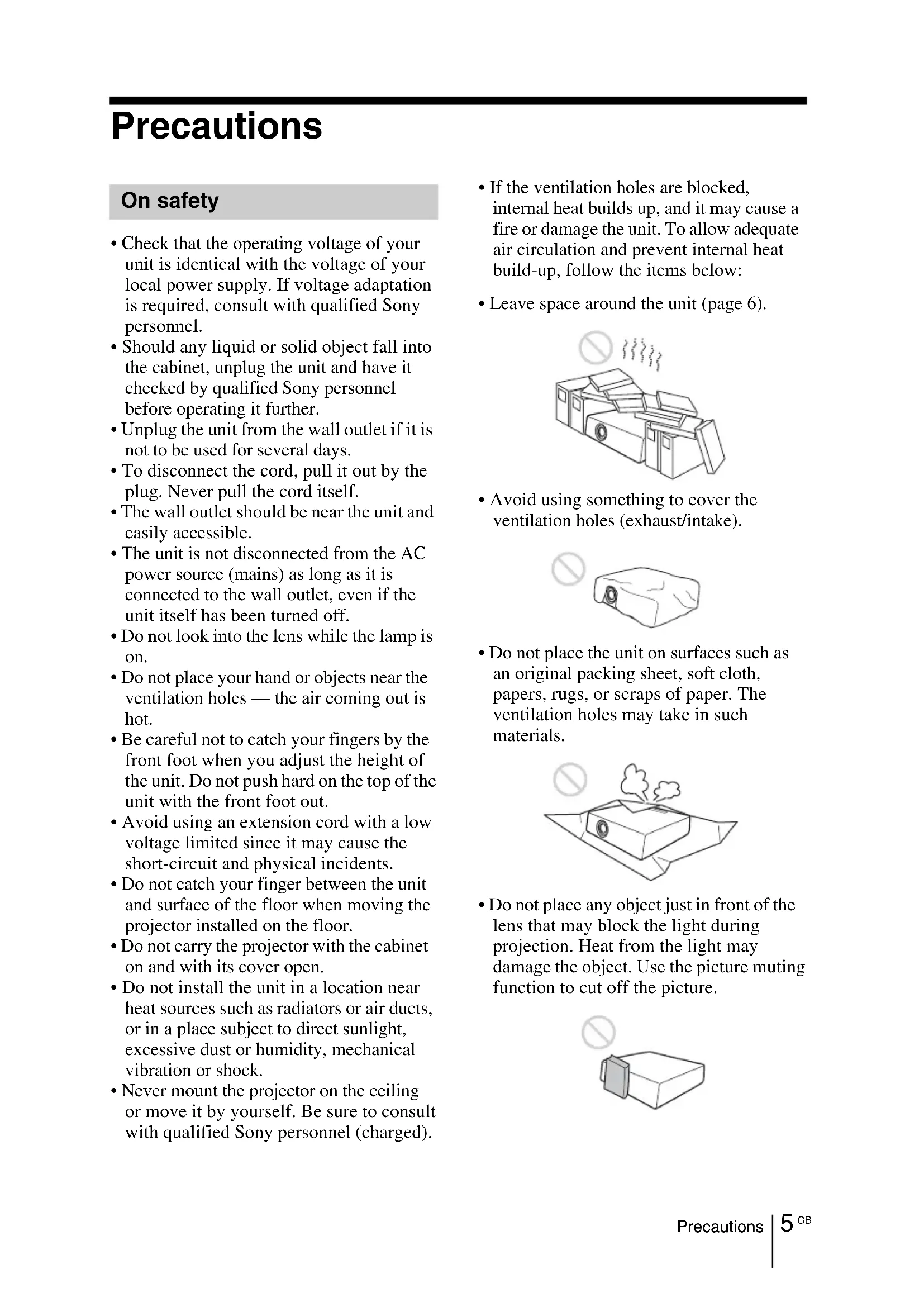 - Do not place any object just in front of the lens that may block the light during projection. Heat from the light may damage the object. Use the picture muting function to cut off the picture. On safetyGB 6 Precautions
