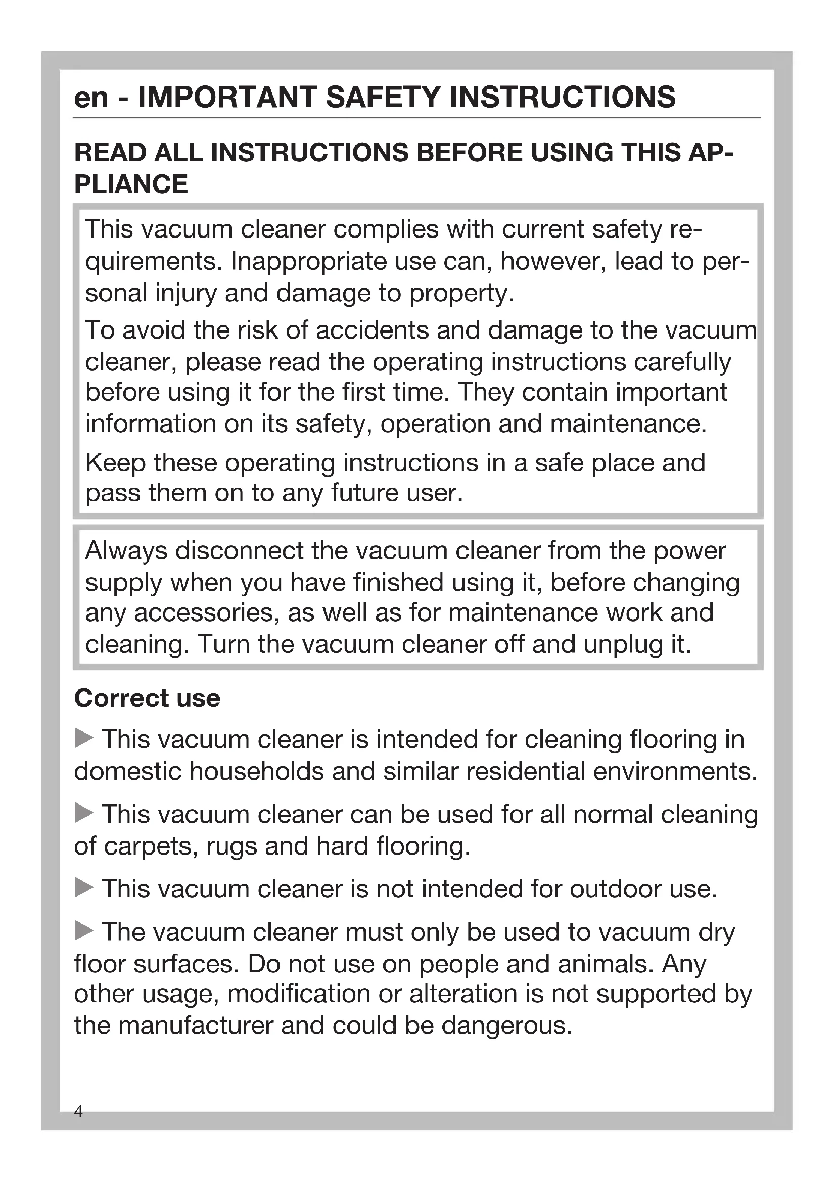 READ ALL INSTRUCTIONS BEFORE USING THIS AP- PLIANCE This vacuum cleaner complies with current safety re- quirements. Inappropriate use can, however, lead to per- sonal injury and damage to property. To avoid the risk of accidents and damage to the vacuum cleaner, please read the operating instructions carefully before using it for the first time. They contain important information on its safety, operation and maintenance. Keep these operating instructions in a safe place and pass them on to any future user. Always disconnect the vacuum cleaner from the power supply when you have finished using it, before changing any accessories, as well as for maintenance work and cleaning. Turn the vacuum cleaner off and unplug it. Correct use This vacuum cleaner is intended for cleaning flooring in domestic households and similar residential environments. This vacuum cleaner can be used for all normal cleaning of carpets, rugs and hard flooring. This vacuum cleaner is not intended for outdoor use. The vacuum cleaner must only be used to vacuum dry floor surfaces. Do not use on people and animals. Any other usage, modification or alteration is not supported by the manufacturer and could be dangerous.en - IMPORTANT SAFETY INSTRUCTIONS