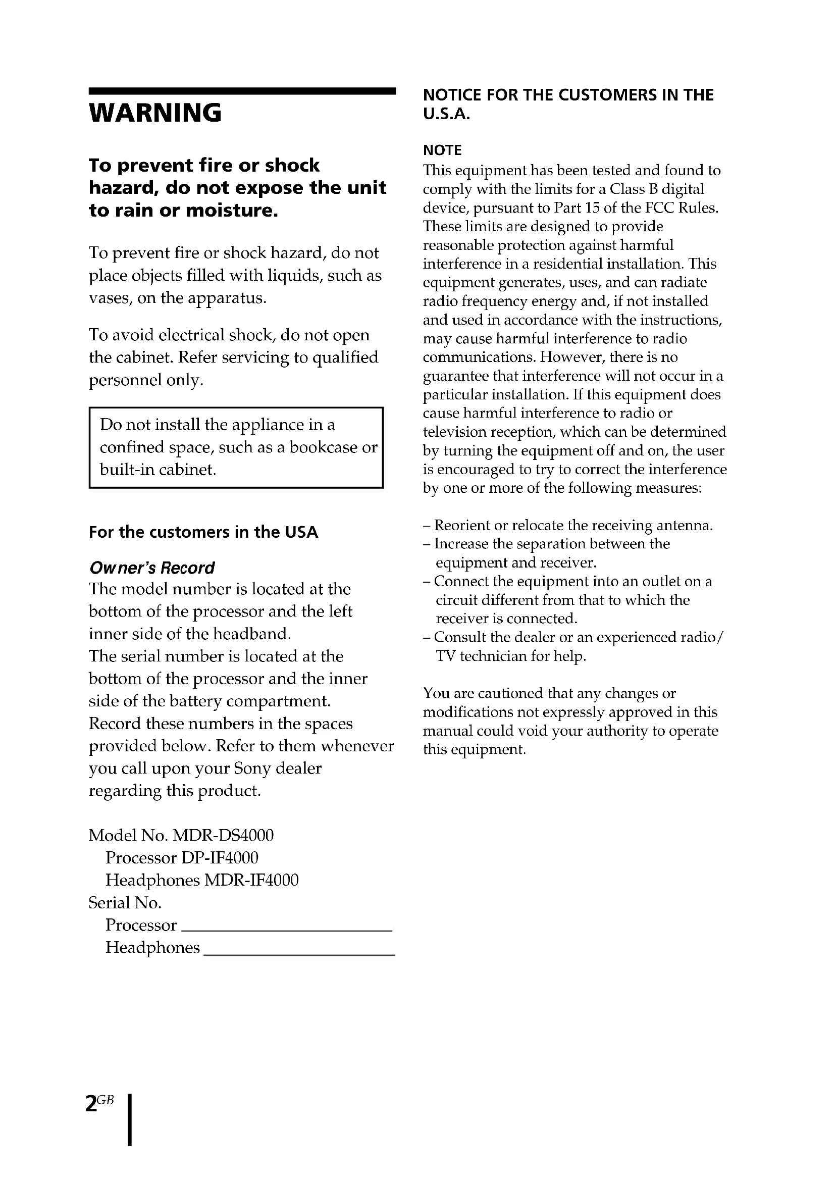 WARNING To prevent fire or shock hazard, do not expose the unit to rain or moisture. To prevent fire or shock hazard, do not place objects filled with liquids, such as vases, on the apparatus. To avoid electrical shock, do not open the cabinet. Refer servicing to qualified personnel only. Do not install the appliance in a confined space, such as a bookcase or built-in cabinet. For the customers in the USA Owner’s Record The model number is located at the bottom of the processor and the left inner side of the headband. The serial number is located at the bottom of the processor and the inner side of the battery compartment. Record these numbers in the spaces provided below. Refer to them whenever you call upon your Sony dealer regarding this product. Model No. MDR-DS4000 Processor DP-IF4000 Headphones MDR-IF4000 Serial No. Processor Headphones