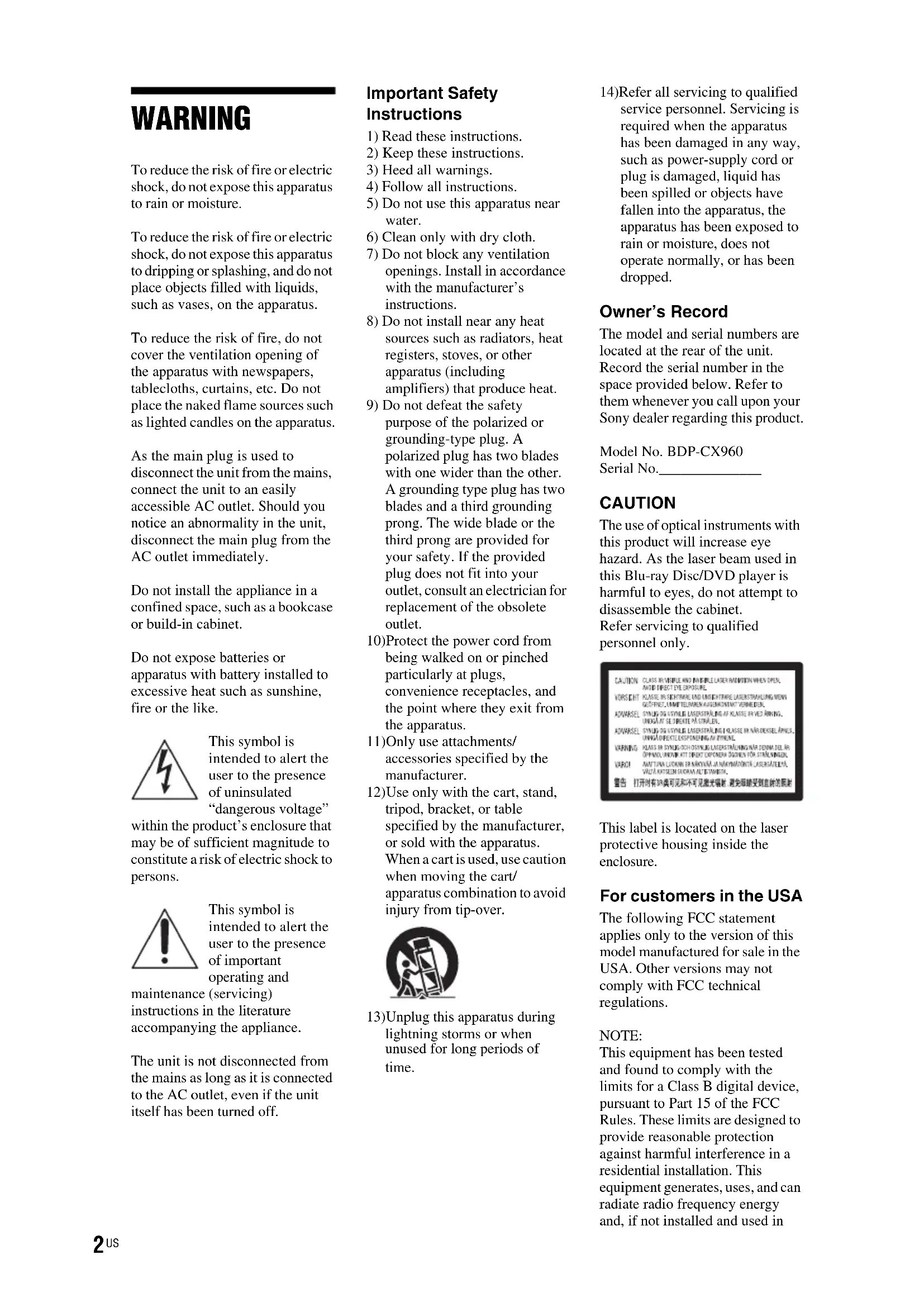 purpose of the polarized or grounding-type plug. A polarized plug has two blades with one wider than the other. A grounding type plug has two blades and a third grounding prong. The wide blade or the third prong are provided for your safety. If the provided plug does not fit into your outlet, consult an electrician for replacement of the obsolete outlet. 10)Protect the power cord from being walked on or pinched particularly at plugs, convenience receptacles, and the point where they exit from the apparatus. 11)Only use attachments/ accessories specified by the manufacturer. 12)Use only with the cart, stand, tripod, bracket, or table specified by the manufacturer, or sold with the apparatus. When a cart is used, use caution when moving the cart/ apparatus combination to avoid injury from tip-over. 13)Unplug this apparatus during lightning storms or when unused for long periods of time. 14)Refer all servicing to qualified service personnel. Servicing is required when the apparatus has been damaged in any way, such as power-supply cord or plug is damaged, liquid has been spilled or objects have fallen into the apparatus, the apparatus has been exposed to rain or moisture, does not operate normally, or has been dropped. Owner’s Record The model and serial numbers are located at the rear of the unit. Record the serial number in the space provided below. Refer to them whenever you call upon your Sony dealer regarding this product. Model No. BDP-CX960 Serial No.______________ CAUTION The use of optical instruments with this product will increase eye hazard. As the laser beam used in this Blu-ray Disc/DVD player is harmful to eyes, do not attempt to disassemble the cabinet. Refer servicing to qualified personnel only. This label is located on the laser protective housing inside the enclosure. For customers in the USA The following FCC statement applies only to the version of this model manufactured for sale in the USA. Other versions may not comply with FCC technical regulations. NOTE: This equipment has been tested and found to comply with the limits for a Class B digital device, pursuant to Part 15 of the FCC Rules. These limits are designed to provide reasonable protection against harmful interference in a residential installation. This equipment generates, uses, and can radiate radio frequency energy and, if not installed and used in3