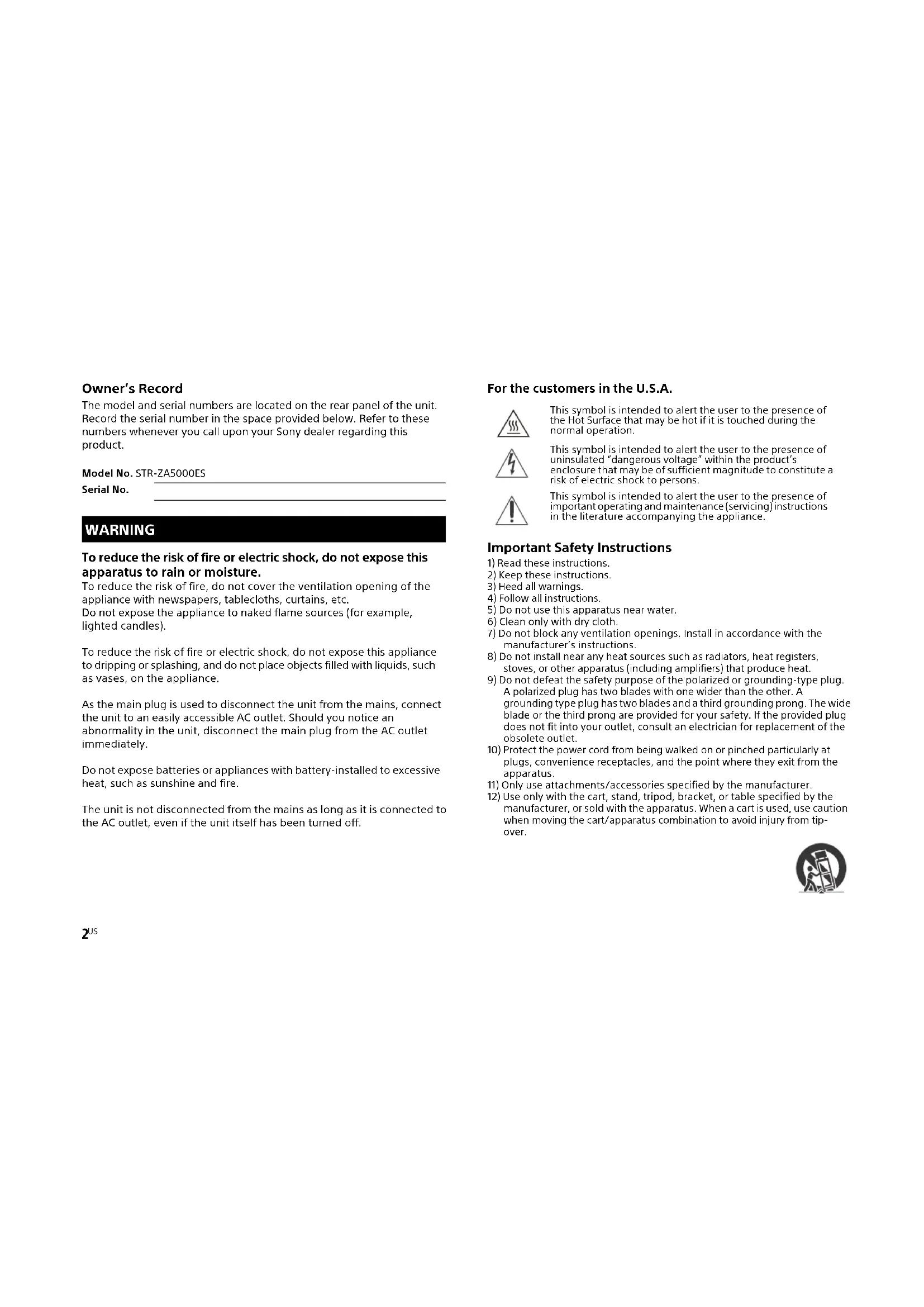 Owner’s Record The model and serial numbers are located on the rear panel of the unit. Record the serial number in the space provided below. Refer to these numbers whenever you call upon your Sony dealer regarding this product. To reduce the risk of fire or electric shock, do not expose this apparatus to rain or moisture. To reduce the risk of fire, do not cover the ventilation opening of the appliance with newspapers, tablecloths, curtains, etc. Do not expose the appliance to naked flame sources (for example, lighted candles). To reduce the risk of fire or electric shock, do not expose this appliance to dripping or splashing, and do not place objects filled with liquids, such as vases, on the appliance. As the main plug is used to disconnect the unit from the mains, connect the unit to an easily accessible AC outlet. Should you notice an abnormality in the unit, disconnect the main plug from the AC outlet immediately. Do not expose batteries or appliances with battery-installed to excessive heat, such as sunshine and fire. The unit is not disconnected from the mains as long as it is connected to the AC outlet, even if the unit itself has been turned off. For the customers in the U.S.A. Important Safety Instructions