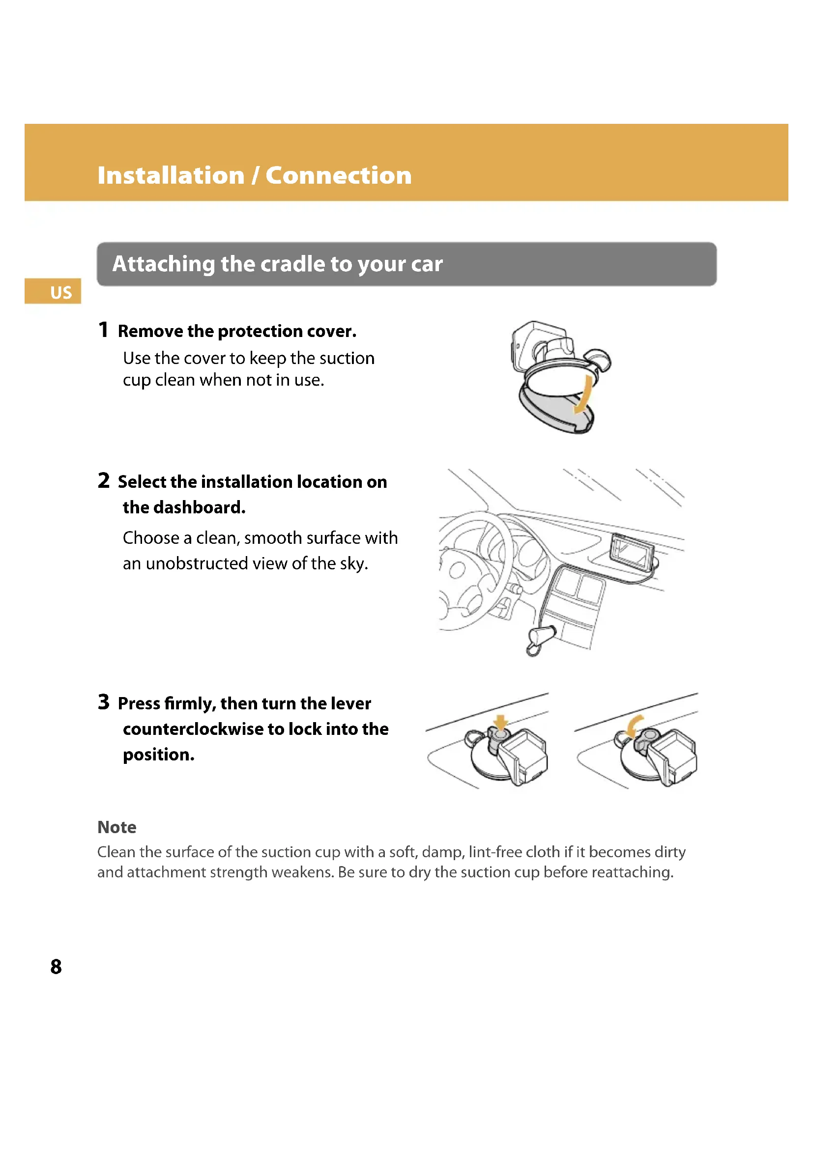 Installation / Connection Attaching the cradle to your car 1 Remove the protection cover. Use the cover to keep the suction cup clean when not in use. 2 Select the installation location on the dashboard. Choose a clean, smooth surface with an unobstructed view of the sky. 3 Press firmly, then turn the lever counterclockwise to lock into the position. Note Clean the surface of the suction cup with a soft, damp, lint-free cloth if it becomes dirty and attachment strength weakens. Be sure to dry the suction cup before reattaching.SONY NV-U94T/U84 (US,FR,ES) 4-107-848-11 (1)