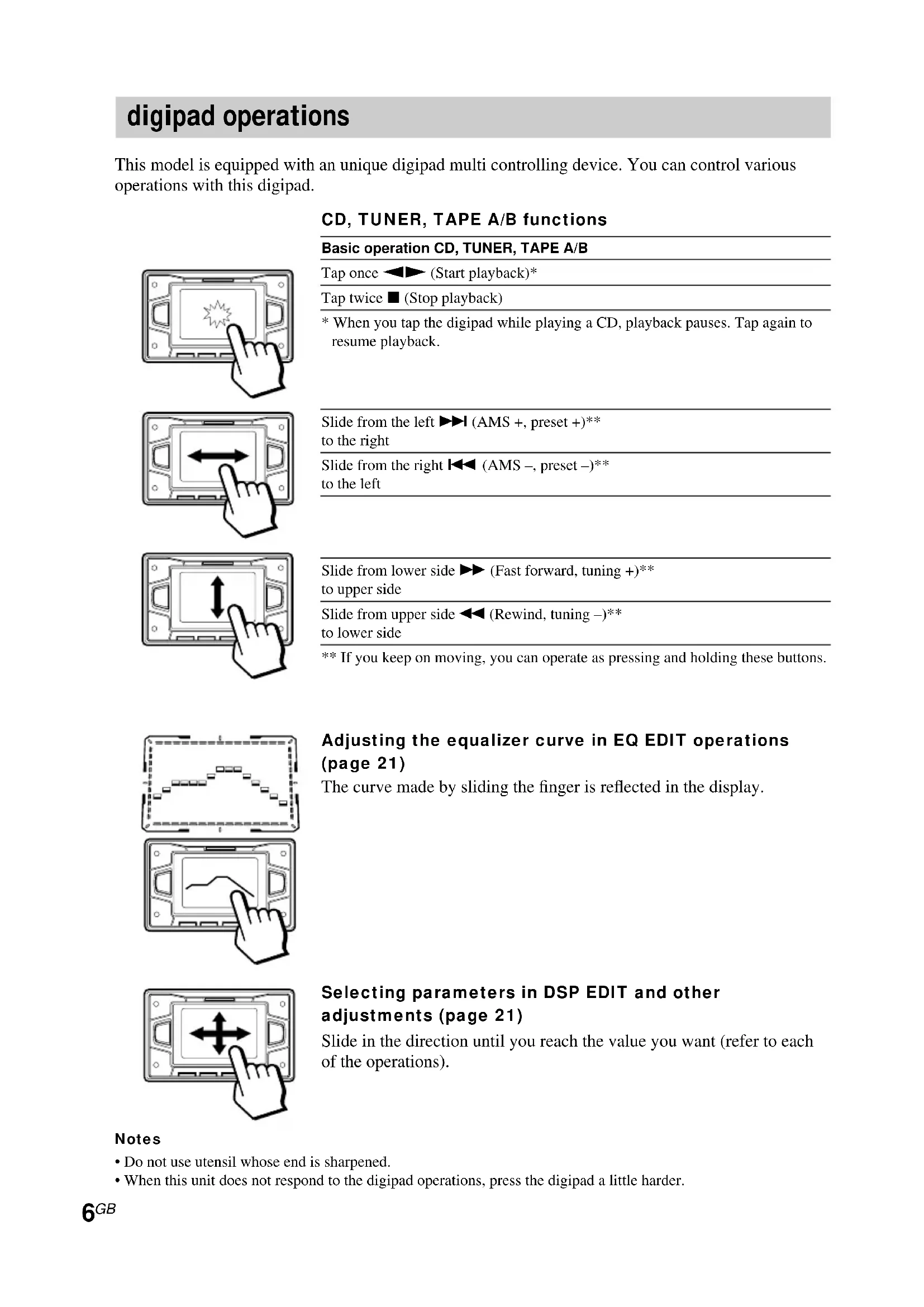 - When you tap the digipad while playing a CD, playback pauses. Tap again to resume playback. Slide from the left > (AMS +, preset +)** to the right Slide from the right . (AMS –, preset –)** to the left Slide from lower side M (Fast forward, tuning +)** to upper side Slide from upper side m (Rewind, tuning –)** to lower side ** If you keep on moving, you can operate as pressing and holding these buttons. Adjusting the equalizer curve in EQ EDIT operations (page 21) The curve made by sliding the finger is reflected in the display. Selecting parameters in DSP EDIT and other adjustments (page 21) Slide in the direction until you reach the value you want (refer to each of the operations). Notes
