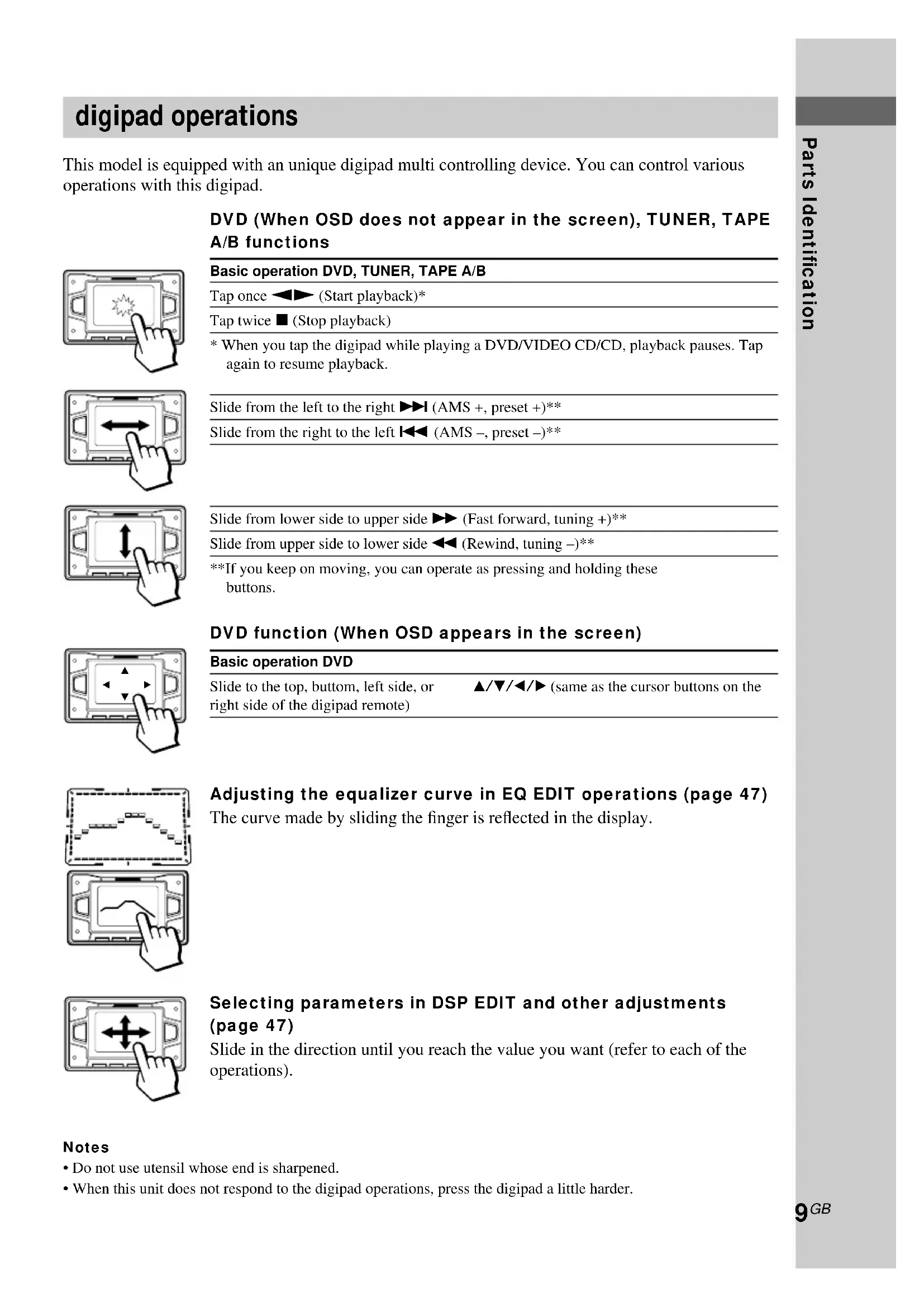 digipad operations This model is equipped with an unique digipad multi controlling device. You can control various operations with this digipad. DVD (When OSD does not appear in the screen), TUNER, TAPE A/B functions Basic operation DVD, TUNER, TAPE A/BTap once nN (Start playback)*Tap twice x (Stop playback)* When you tap the digipad while playing a DVD/VIDEO CD/CD, playback pauses. Tapagain to resume playback.Slide from the left to the right > (AMS +, preset +)**Slide from the right to the left . (AMS –, preset –)**Slide from lower side to upper side M (Fast forward, tuning +)**Slide from upper side to lower side m (Rewind, tuning –)****If you keep on moving, you can operate as pressing and holding thesebuttons. DVD function (When OSD appears in the screen) Basic operation DVD Slide to the top, buttom, left side, or v/V/b/B (same as the cursor buttons on the right side of the digipad remote) Adjusting the equalizer curve in EQ EDIT operations (page 47) The curve made by sliding the finger is reflected in the display. Selecting parameters in DSP EDIT and other adjustments (page 47) Slide in the direction until you reach the value you want (refer to each of the operations). Notes• Do not use utensil whose end is sharpened.• When this unit does not respond to the digipad operations, press the digipad a little harder.