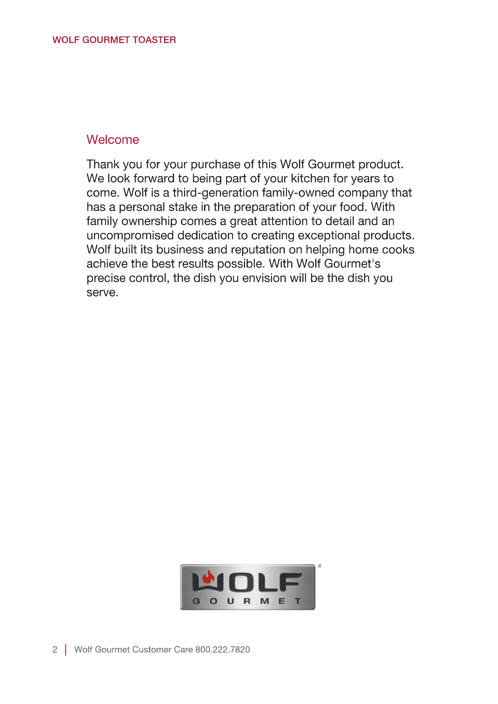 Wolf Gourmet Customer Care 800.222.7820 Welcome Thank you for your purchase of this Wolf Gourmet product. We look forward to being part of your kitchen for years to come. Wolf is a third-generation family-owned company that has a personal stake in the preparation of your food. With family ownership comes a great attention to detail and an uncompromised dedication to creating exceptional products. Wolf built its business and reputation on helping home cooks achieve the best results possible. With Wolf Gourmet's precise control, the dish you envision will be the dish you serve.