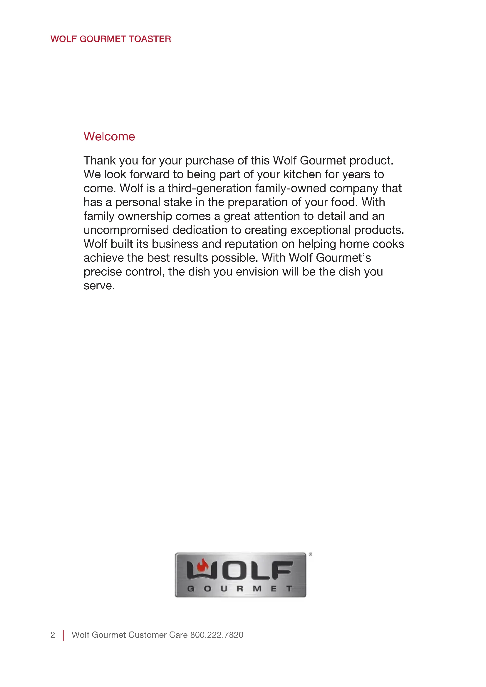 Thank you for your purchase of this Wolf Gourmet product. We look forward to being part of your kitchen for years to come. Wolf is a third-generation family-owned company that has a personal stake in the preparation of your food. With family ownership comes a great attention to detail and an uncompromised dedication to creating exceptional products. Wolf built its business and reputation on helping home cooks achieve the best results possible. With Wolf Gourmet's precise control, the dish you envision will be the dish you serve.