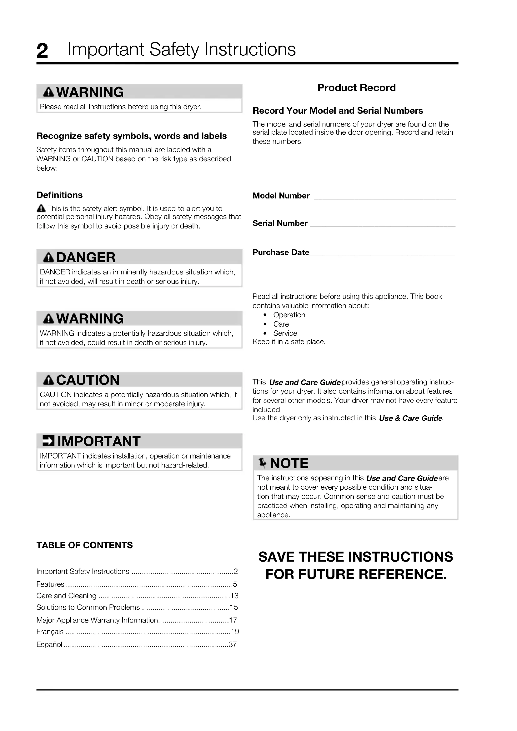 NOTE The instructions appearing in this Use and Care Guide are not meant to cover every possible condition and situa-tion that may occur. Common sense and caution must be practiced when installing, operating and maintaining any appliance.Read all instructions before using this appliance. This book contains valuable information about:• Operation• Care• ServiceKeep it in a safe place.Model Number ___________________________________Serial Number ____________________________________Purchase Date____________________________________This Use and Care Guide provides general operating instruc-tions for your dryer. It also contains information about features for several other models. Your dryer may not have every feature included. Use the dryer only as instructed in this Use & Care Guide