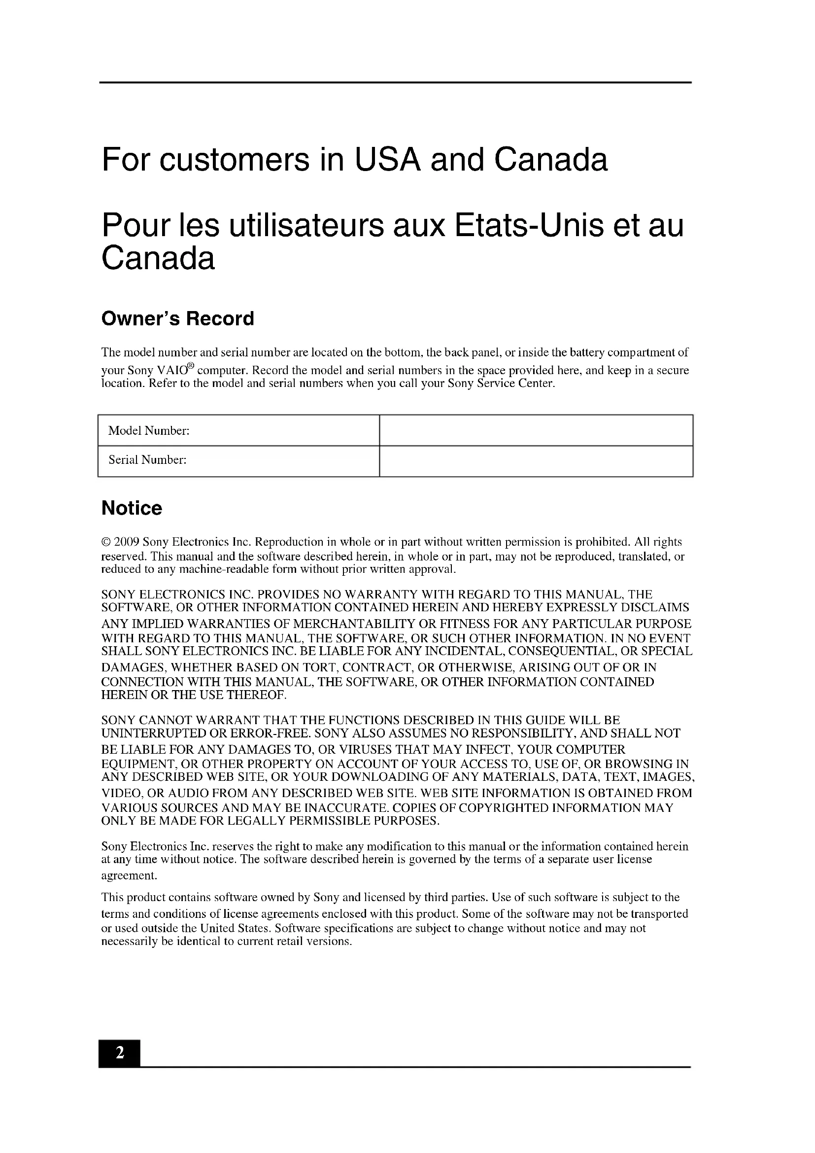 computer. Record the model and serial numbers in the space provided here, and keep in a secure location. Refer to the model and serial numbers when you call your Sony Service Center. Notice © 2009 Sony Electronics Inc. Reproduction in whole or in part without written permission is prohibited. All rights reserved. This manual and the software described herein, in whole or in part, may not be reproduced, translated, or reduced to any machine-readable form without prior written approval. SONY ELECTRONICS INC. PROVIDES NO WARRANTY WITH REGARD TO THIS MANUAL, THE SOFTWARE, OR OTHER INFORMATION CONTAINED HEREIN AND HEREBY EXPRESSLY DISCLAIMS ANY IMPLIED WARRANTIES OF MERCHANTABILITY OR FITNESS FOR ANY PARTICULAR PURPOSE WITH REGARD TO THIS MANUAL, THE SOFTWARE, OR SUCH OTHER INFORMATION. IN NO EVENT SHALL SONY ELECTRONICS INC. BE LIABLE FOR ANY INCIDENTAL, CONSEQUENTIAL, OR SPECIAL DAMAGES, WHETHER BASED ON TORT, CONTRACT, OR OTHERWISE, ARISING OUT OF OR IN CONNECTION WITH THIS MANUAL, THE SOFTWARE, OR OTHER INFORMATION CONTAINED HEREIN OR THE USE THEREOF. SONY CANNOT WARRANT THAT THE FUNCTIONS DESCRIBED IN THIS GUIDE WILL BE UNINTERRUPTED OR ERROR-FREE. SONY ALSO ASSUMES NO RESPONSIBILITY, AND SHALL NOT BE LIABLE FOR ANY DAMAGES TO, OR VIRUSES THAT MAY INFECT, YOUR COMPUTER EQUIPMENT, OR OTHER PROPERTY ON ACCOUNT OF YOUR ACCESS TO, USE OF, OR BROWSING IN ANY DESCRIBED WEB SITE, OR YOUR DOWNLOADING OF ANY MATERIALS, DATA, TEXT, IMAGES, VIDEO, OR AUDIO FROM ANY DESCRIBED WEB SITE. WEB SITE INFORMATION IS OBTAINED FROM VARIOUS SOURCES AND MAY BE INACCURATE. COPIES OF COPYRIGHTED INFORMATION MAY ONLY BE MADE FOR LEGALLY PERMISSIBLE PURPOSES. Sony Electronics Inc. reserves the right to make any modification to this manual or the information contained herein at any time without notice. The software described herein is governed by the terms of a separate user license agreement. This product contains software owned by Sony and licensed by third parties. Use of such software is subject to the terms and conditions of license agreements enclosed with this product. Some of the software may not be transported or used outside the United States. Software specifications are subject to change without notice and may not necessarily be identical to current retail versions. Model Number: Serial Number:3 Certain product(s) included with this computer may include features such as copy protection and content management technology. USE OF THE SOFTWARE PRODUCT(S) REQUIRES AGREEMENT TO APPLICABLE END USER AGREEMENTS AND FULL COMPLIANCE WITH APPLICABLE PRODUCT ACTIVATION PROCEDURES. Product activation procedures and privacy policies will be detailed during initial launch of the software product(s), or upon certain reinstallations of the software product(s), or reconfigurations of the computer, and may be completed by Internet or telephone (toll charges may apply). Updates and additions to software may require an additional charge. Subscriptions to online service providers may require a fee and credit card information. Financial services may require prior arrangements with participating financial institutions. Important information for Canadian customers: Your new VAIO