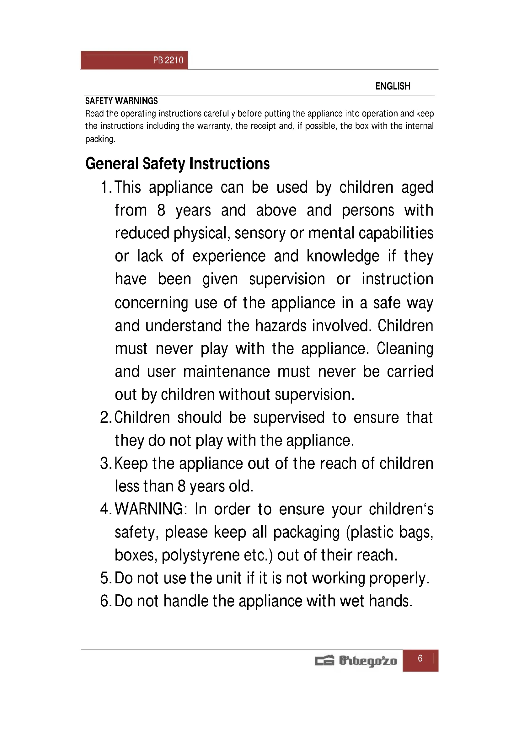 Find the device manual for free PB 2210 Orbegozo in PDF.