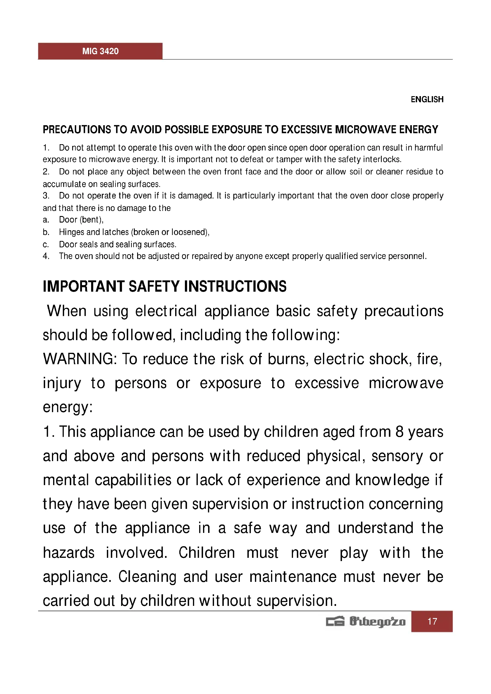 Download the instructions for your Microwave Oven in PDF format for free! Find your manual MIG 3420 - Orbegozo and take your electronic device back in hand. On this page are published all the documents necessary for the use of your device. MIG 3420 by Orbegozo.
