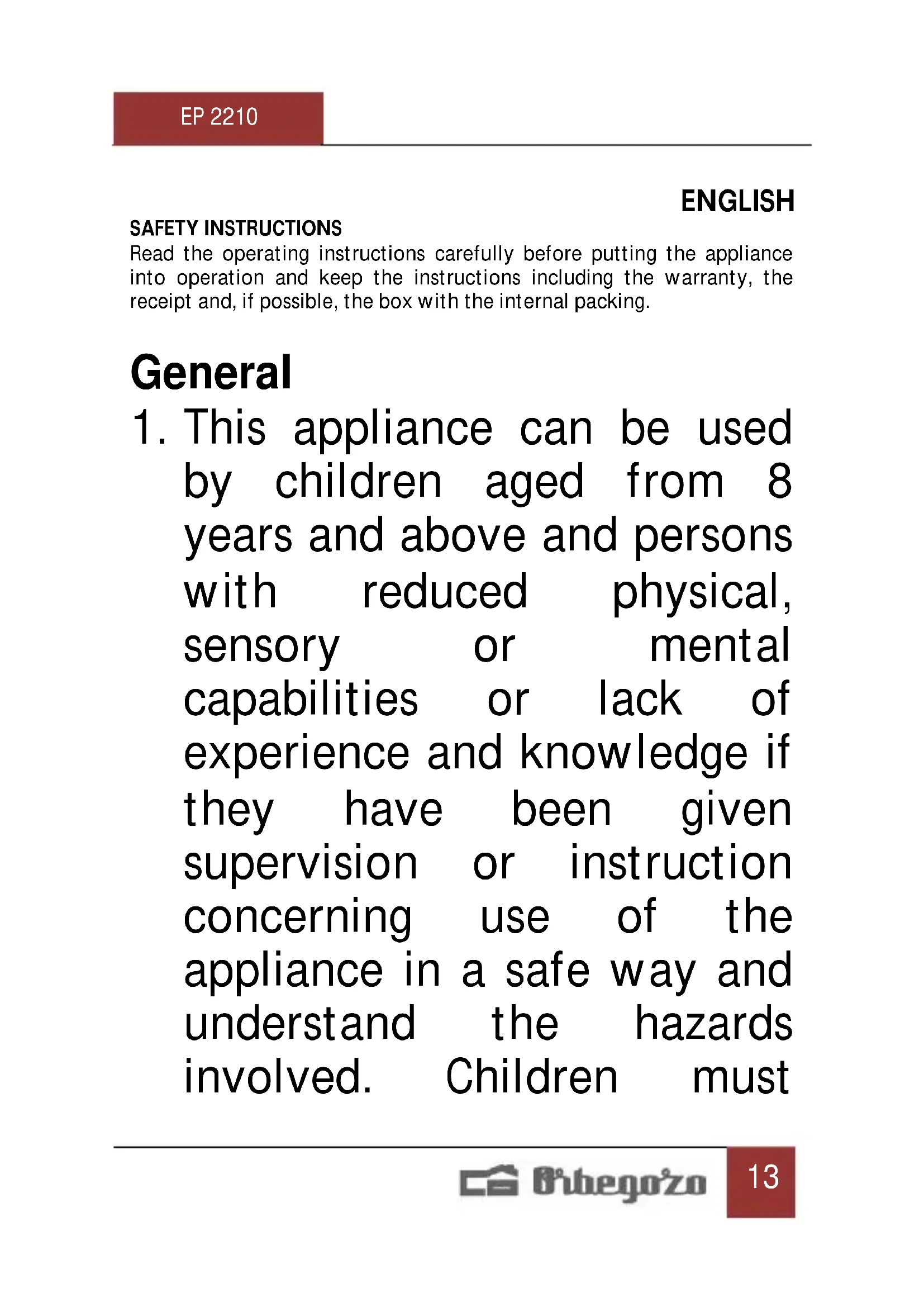 - This appliance can be used by children aged from 8 years and above if they have been given supervision or instruction concerning use of the appliance in a safe wayEP 221