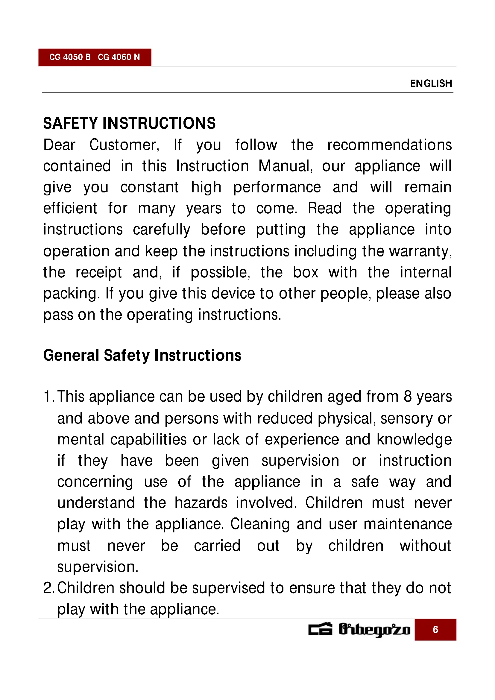 USER MANUAL CG 4060 N Orbegozo