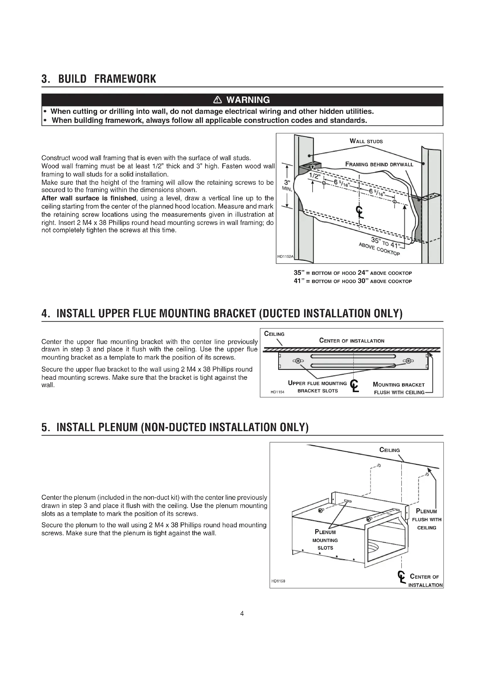- When building framework, always follow all applicable construction codes and standards. Construct wood wall framing that is even with the surface of wall studs.Wood wall framing must be at least 1/2” thick and 3” high. Fasten wood wall framing to wall studs for a solid installation.Make sure that the height of the framing will allow the retaining screws to be secured to the framing within the dimensions shown.After wall surface is finished, using a level, draw a vertical line up to the ceiling starting from the center of the planned hood location. Measure and mark the retaining screw locations using the measurements given in illustration at right. Insert 2 M4 x 38 Phillips round head mounting screws in wall framing; do not completely tighten the screws at this time.