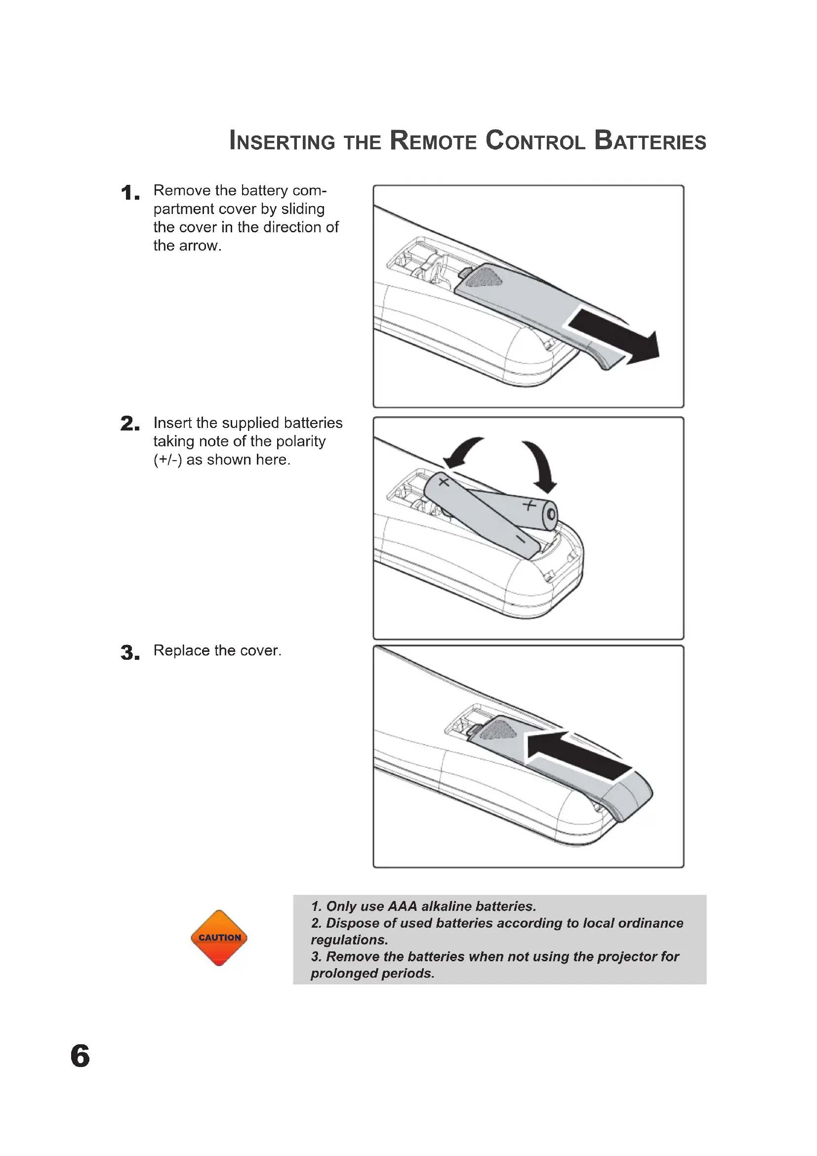 Replace the cover. CAUTION CAUTION 1. Only use AAA alkaline batteries.2. Dispose of used batteries according to local ordinance regulations. 3. Remove the batteries when not using the projector for prolonged periods.7