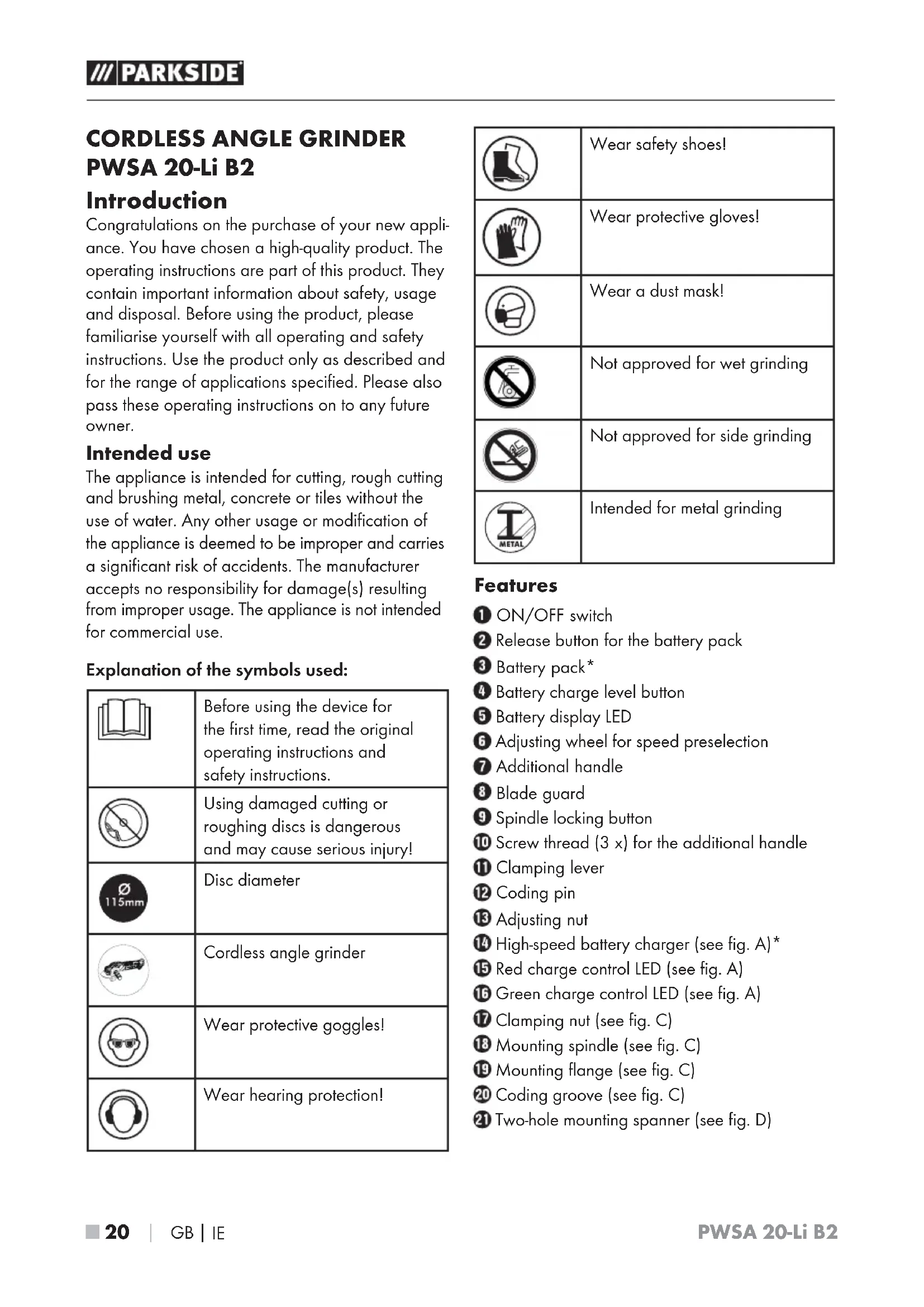 PWSA 20-Li B2 Introduction Congratulations on the purchase of your new appli- ance. You have chosen a high-quality product. The operating instructions are part of this product. They contain important information about safety, usage and disposal. Before using the product, please familiarise yourself with all operating and safety instructions. Use the product only as described and for the range of applications specified. Please also pass these operating instructions on to any future owner. Intended use The appliance is intended for cutting, rough cutting and brushing metal, concrete or tiles without the use of water. Any other usage or modification of the appliance is deemed to be improper and carries a significant risk of accidents. The manufacturer accepts no responsibility for damage(s) resulting from improper usage. The appliance is not intended for commercial use. Explanation of the symbols used: Before using the device for the first time, read the original operating instructions and safety instructions. Using damaged cutting or roughing discs is dangerous and may cause serious injury! Disc diameter Cordless angle grinder Wear protective goggles! Wear hearing protection! Wear safety shoes! Wear protective gloves! Wear a dust mask! Not approved for wet grinding Not approved for side grinding Intended for metal grinding Features ON/OFF switch Release button for the battery pack Battery pack* Battery charge level button Battery display LED Adjusting wheel for speed preselection Additional handle Blade guard Spindle locking button Screw thread (3 x) for the additional handle Clamping lever Coding pin Adjusting nut High-speed battery charger (see fig. A)* Red charge control LED (see fig. A) Green charge control LED (see fig. A) Clamping nut (see fig. C) Mounting spindle (see fig. C) Mounting flange (see fig. C) Coding groove (see fig. C) Two-hole mounting spanner (see fig. D)PWSA 20-Li B2