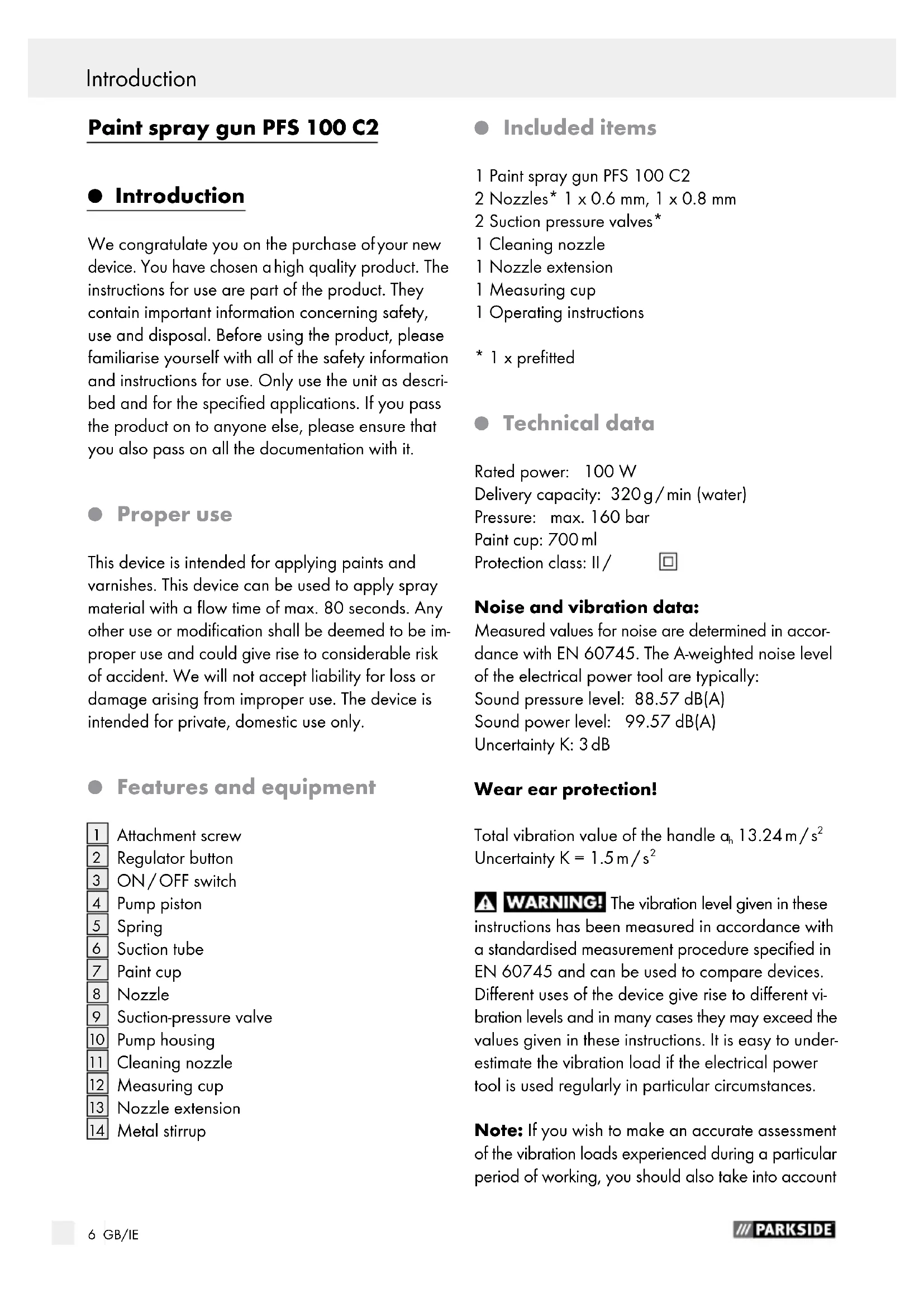 Technical data Rated power: 100 W Delivery capacity: 320 g / min (water) Pressure: max. 160 bar Paint cup: 700 ml Protection class: II / Noise and vibration data: Measured values for noise are determined in accor- dance with EN 60745. The A-weighted noise level of the electrical power tool are typically: Sound pressure level: 88.57 dB(A) Sound power level: 99.57 dB(A) Uncertainty K: 3 dB Wear ear protection! Total vibration value of the handle a