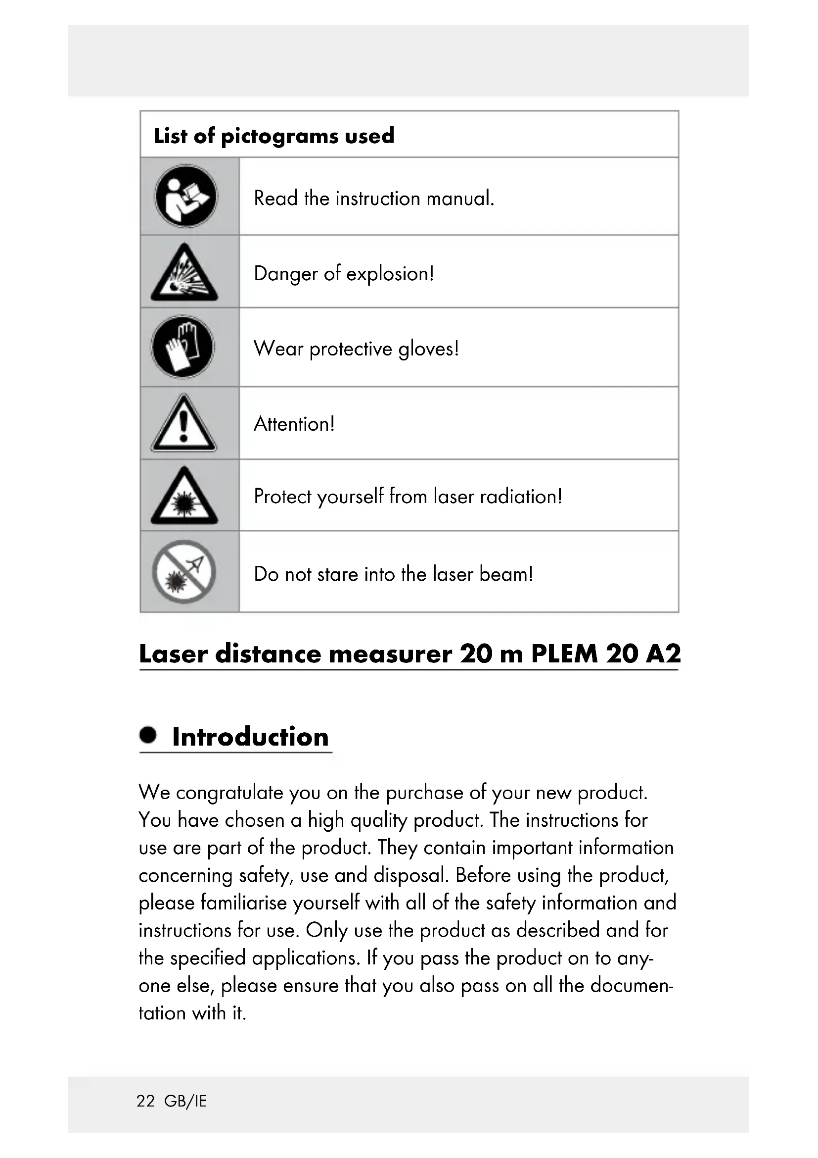 INTO BEAM! CLASS 2 LASER PRODUCT! Never look directly into the laser beam or into the opening from which it emerges. Looking at a laser beam through optical instruments (e.g. magnifying glasses etc.) can cause eye injuries. ATTENTION! If operating and adjustment equipment is used or procedures other than those specified here are carried out, this may result in hazardous radiation exposure. Never aim the laser beam at reflective surfaces, people or animals. Even brief visual contact with a laser beam can result in eye injuries. Safety instructions for batteries / rechargeable batteries DANGER TO LIFE! Keep batteries / rechargeable batter- ies out of reach of children. If accidentally swallowed seek immediate medical attention. DANGER OF EXPLOSION! Never recharge non-rechargeable batteries. Do not short-circuit batteries / rechargeable batteries and / or open them. Overheating, fire or bursting can be the result. Never throw batteries / rechargeable batteries into fire or water.27 GB/IE Do not exert mechanical loads to batteries / rechargeable batteries. Risk of leakage of batteries / rechargeable batteries Avoid extreme environmental conditions and temperatures, which could affect batteries / rechargeable batteries, e.g. radiators / direct sunlight. If batteries / rechargeable batteries have leaked, avoid contact with skin, eyes and mucous membranes with the chemicals! Flush immediately the affected areas with fresh water and seek medical attention! WEAR PROTECTIVE GLOVES! Leaked or damaged batteries / rechargeable batteries can cause burns on contact with the skin. Wear suit- able protective gloves at all times if such an event occurs. In the event of a leakage of batteries / rechargeable bat- teries, immediately remove them from the product to pre- vent damage. Only use the same type of batteries / rechargeable batteries. Do not mix used and new batteries / rechargeable batteries. Remove batteries / rechargeable batteries if the product will not be used for a longer period. Risk of damage of the product Only use the specified type of battery / rechargeable battery! Insert batteries / rechargeable batteries according to polar- ity marks (+) and (-) on the battery / rechargeable battery and the product. Clean the contacts on the battery / rechargeable battery and in the battery compartment before inserting! Remove exhausted batteries / rechargeable batteries from the product immediately.28 GB/IE Before using Check the consignment for completeness and for signs of visible damage. Remove all packaging material from the product. Inserting / replacing the batteries When the low battery icon appears in the display