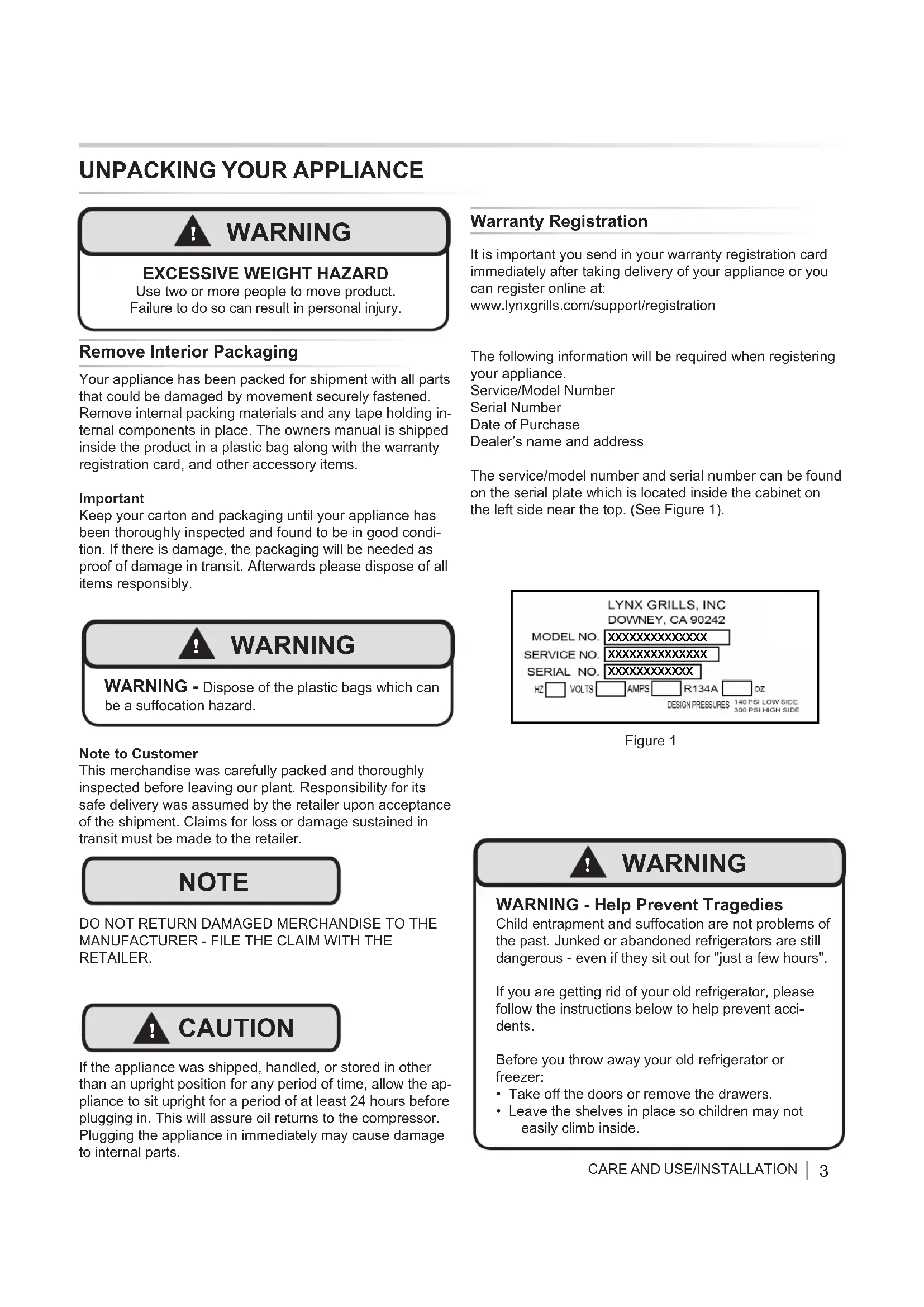 Warranty Registration Remove Interior Packaging XXXXXXXXXXXXXXXXXXXXXXXXXXXXXXXXXXXXXXXX It is important you send in your warranty registration card immediately after taking delivery of your appliance or you can register online at: www.lynxgrills.com/support/registration The following information will be required when registering your appliance. Service/Model Number Serial Number Date of Purchase Dealer’s name and address The service/model number and serial number can be found on the serial plate which is located inside the cabinet on the left side near the top. (See Figure 1).