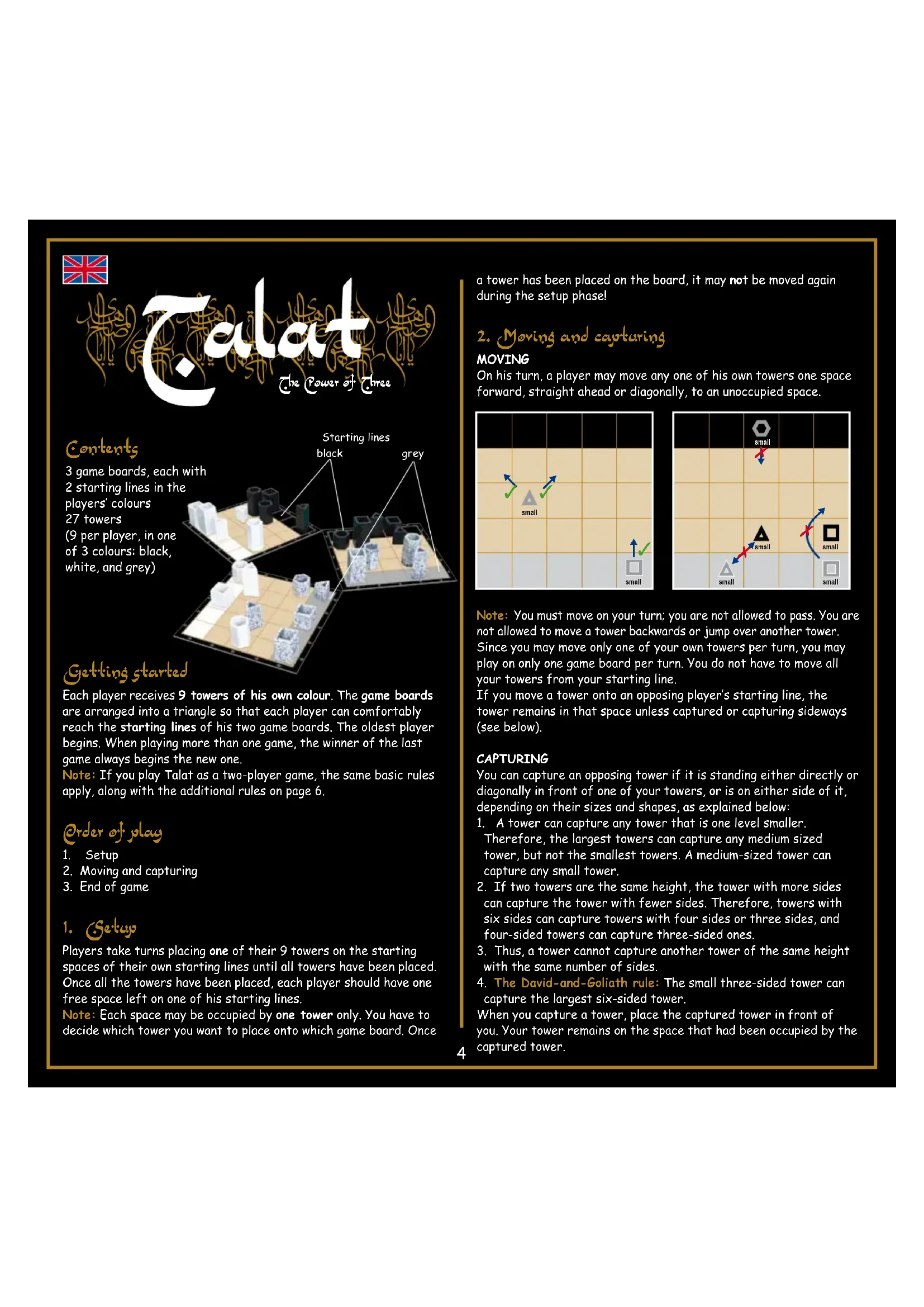 MOVINGOn his turn, a player may move any one of his own towers one space forward, straight ahead or diagonally, to an unoccupied space.Note: You must move on your turn; you are not allowed to pass. You are not allowed to move a tower backwards or jump over another tower.Since you may move only one of your own towers per turn, you may play on only one game board per turn. You do not have to move all your towers from your starting line.If you move a tower onto an opposing player’s starting line, the tower remains in that space unless captured or capturing sideways (see below).CAPTURINGYou can capture an opposing tower if it is standing either directly or diagonally in front of one of your towers, or is on either side of it, depending on their sizes and shapes, as explained below:1. A tower can capture any tower that is one level smaller. Therefore, the largest towers can capture any medium sized tower, but not the smallest towers. A medium-sized tower can capture any small tower.2. If two towers are the same height, the tower with more sides can capture the tower with fewer sides. Therefore, towers with six sides can capture towers with four sides or three sides, and four-sided towers can capture three-sided ones.3. Thus, a tower cannot capture another tower of the same height with the same number of sides.4. The David-and-Goliath rule: The small three-sided tower can capture the largest six-sided tower.When you capture a tower, place the captured tower in front of you. Your tower remains on the space that had been occupied by the captured tower. Contents 3 game boards, each with 2 starting lines in the players’ colours27 towers (9 per player, in one of 3 colours: black, white, and grey)The Power of ThreeStarting linesblack greymediumsmallsmallsmallmedium largelargemedium